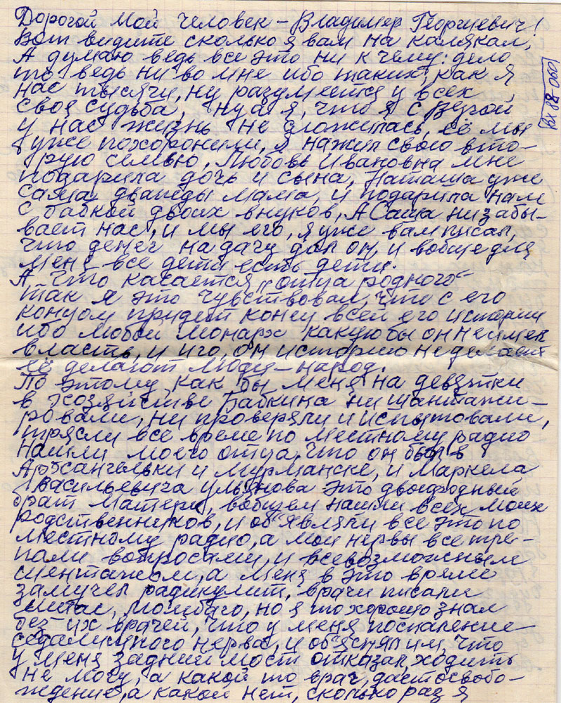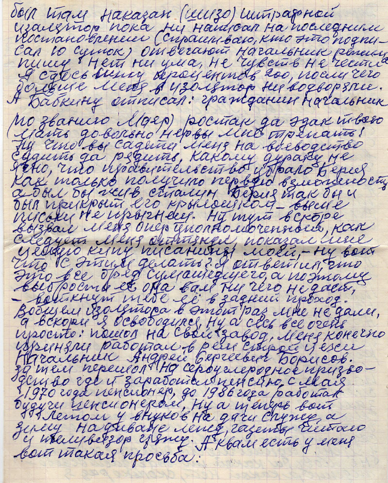 По этому, как бы меня на девятки в хозяйстве Бабкина ни шантажировали, ни проверяли, и испытовали, трясли все время по местному радио нашли моего отца, что он был в Архангельки и Мурманске, и Маркела Васильевича Ульянова это двоюродный брат матери, вобщем нашли всех моих родственников, и об”являли все это по местному радио, а мои нервывсе трепали вопросами, и всевозможным шентажом, а меня в это время замучел радикулит, врачи писали ???? но я то хорошо знал без их врачей, что у меня поспаление седалищного нерва, и об”яснял им, что у меня задний мост отказал, ходить не могу, а какой то врач, даст освобождение, а какой нет, сколько раз я был там наказан (ШИЗО) штрафной изалятор пока ни написал на последним постановлении (спрашиваю, кто это подписал 10 суток) отвечают начальник режима пишу нет ни ума, не чувств не чести я сдесь сижу процентов 200, посли чего больше больше меня в изолятор ни водворяли.