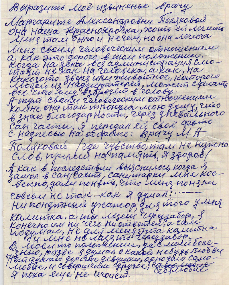 А тут своим человеческим отношением ко мне она так тронула мою душу, что в знак благодарности, через дневального сан части, я передал ей своё фото с надпесью на обороте: Врачу М.А. Поляковой /где чувство, там не нужно слов, прими на память, я здоров/