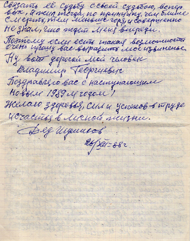 Поздравляю вас с наступающим Новым 1989-м годом, желаю здоровья, сил и успехов в труде и счастья в личной жизни.