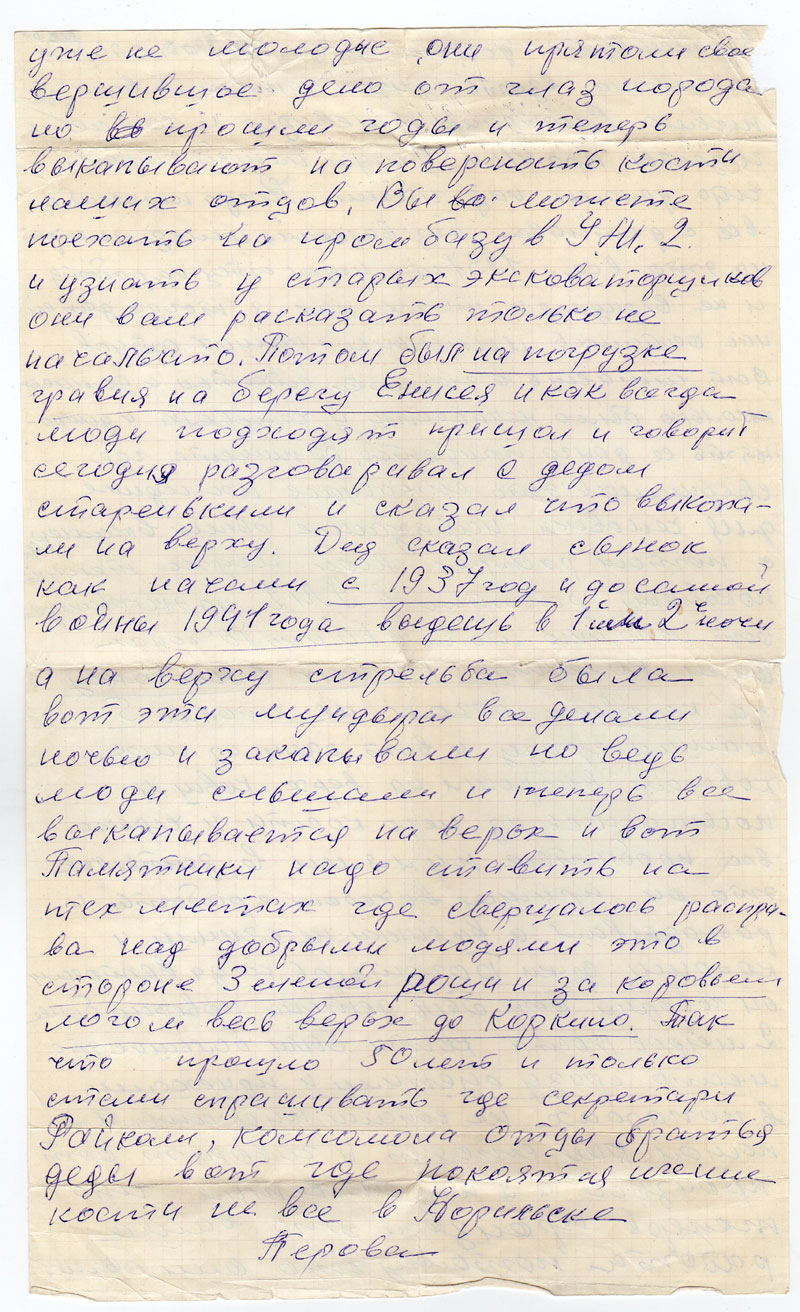 Вот читаешь в гозете статьи и домаеш сколько было ненавести у человека и устронять ее долго придется. Вы пишете где свершалось это страшное последние для человека истязание были в камерах а потом растрел. Мой муж теперь покойный работал в УМ2 эксковаторе вот непомню толи в 60х или 70х годах вели колектор очисных в Песчанку за коровьем логом их стояло 5 машин сразу и вот один из них ковшом выбросил на верх ковш и посыпались из него кости и черепа все пробитые пулями в затылок это он пришол вечером с работы и рассказывал а валинки не сгнили и колоши ф-ки Боготырь когда вытресли он говорил вот был детина новерно более 2 метров роста кости были большие это место сразу оцепили и приехали в попахах не стали пускать. А я пошол к им стоят и говорят вот произвол а я им ответил что теперь произвол это ваша работа потому что они были уже не молодые, они прятали свое свершившое дело от глаз норода но прошли годы и теперь выкапывают на поверхность кости наших отцов. Вы можете поехать на промбазу в УМ2 и узнать у старых эксковаторщиков они расказать только не начальсто. Потом был на погрузке гравия на берегу Енисея и как всегда люди подходят пришло и говорит сегодня разговаривал с дедом стареньким и сказал что выкопали на верху. Дед сказал сынок как начали с 1937 год и до самой войны 1941 года выдешь в 1 ч или 2 ч ночи а на верху стрельба была вот эти мундыры все делали ночью и закапывали но ведь люди слышали и теперь все выкапывается на верьх и вот Памятники надо ставить на тех местах где свершалось расправа над добрыми людями это в стороне Зеленой рощи и за коровьем логом весь верьх до Коркино. Так что прошло 50 лет и только стали спрашивать где секретари Ройкома, комсомола отцы братья деды вот где покоятся ихние кости не все в Норильске.