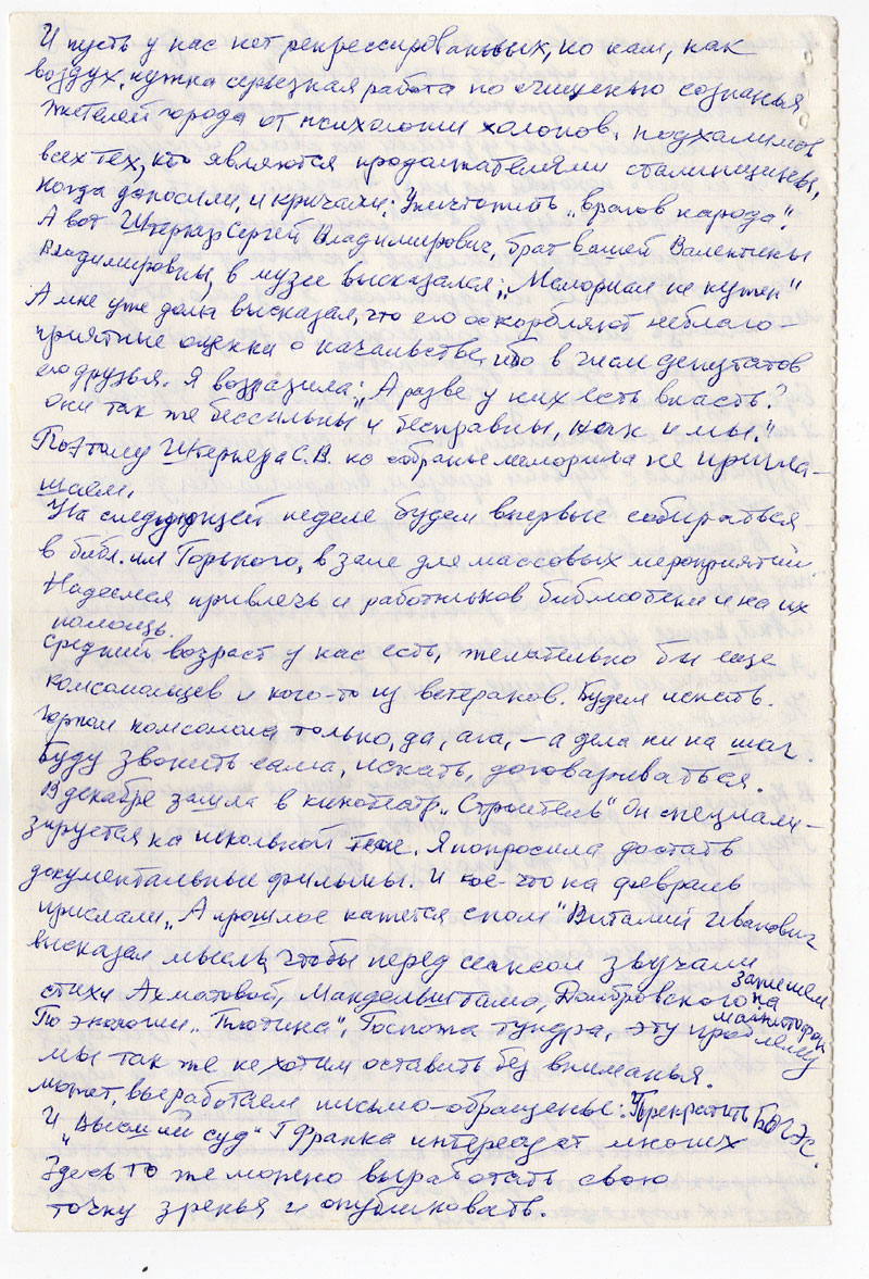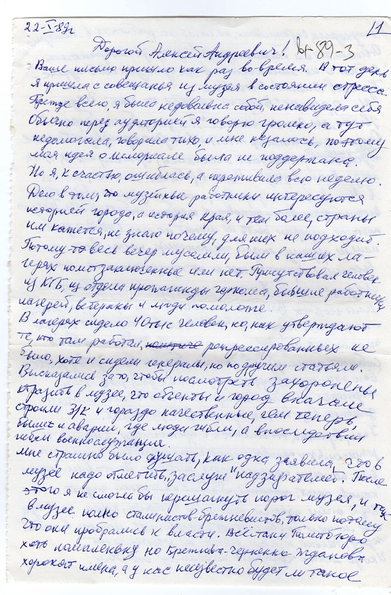 Ваше письмо пришло как раз во-время. В тот день я пришла с совещанья из музея в состоянии стресса. Прежде всего, я была недовольна собой, ненавидела себя Обычно перед аудиторией я говорю громко, а тут недомогала, говорила тихо, и мне казалось, поэтому моя идея о мемориале была не поддержана. Но я, к счастью, ошиблась, а переживала всю неделю. Дело в том, что музейные работники интересуются историей города, а история края, и тем более, страны им кажется, не знаю почему, для них не подходит. Потому-то весь вечер мусолели, были в наших лагерях политзаключенные или нет. Присутствовал человек из КГБ, из отдела пропаганды горкома, бывшие работники лагерей, ветераны и люди помоложе.