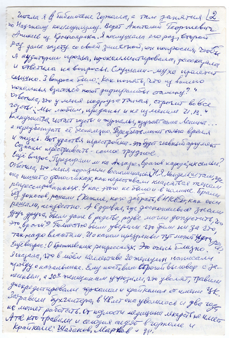 Читала я в библиотеке Горкома, а там занятия по Научному коммунизму. Ведет Анатолий Георгиевич Аникеев из Красноярска. Я послушала его раз, второй раз дала газету со своей заметкой, он попросил чтобы я аудитории прочла, прокоментировала, рассказала и ответила на вопросы. Слушали-муха пролетит слышно. 3 вопроса было: «Как понять, что из вашего поколения взахлеб поют дифирамбы сталину?» ответила, что у меня подруга такая, строчит во все газеты: «Мы любим, преданы и не изменим И.В.» Коммунистка читает газеты и журналы, изучает сама Ленина… а переубеждать её бесполезно. Переубеить может только время и жизнь. Вот удастся перестройка - это будет главный аргумент Сознанье перестраивать - самое трудное.