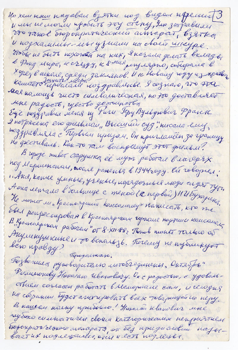 Но хам наш надавал взятки под видом премии и мы не могли пробить эту стену, Улю затравили что такое бюрократический аппарат, взятка и подхалимы - мы узнали на своей шкуре. Чтобы не быть похожей на них, я начала делать вклады в Фонд мира, к съезду, к 8 мая регулярно, собирала в хоре, в школе, среди земляков. И к Новому году из краевого комитета защиты мира прислали поздравленье. Я сознаю, что эта моя помощь чисто символическая, но это доставляет мне радость, чувство достоинства.