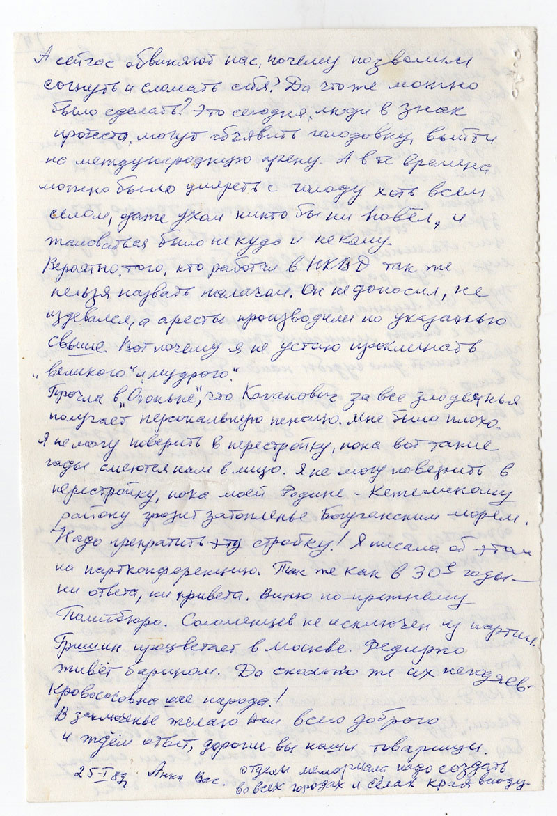 В заключенье желаю Вам всего доброго и ждем ответ, дорогие вы наши товарищи. Отделы Мемориала надо создать во всех городах и селах края- всюду.