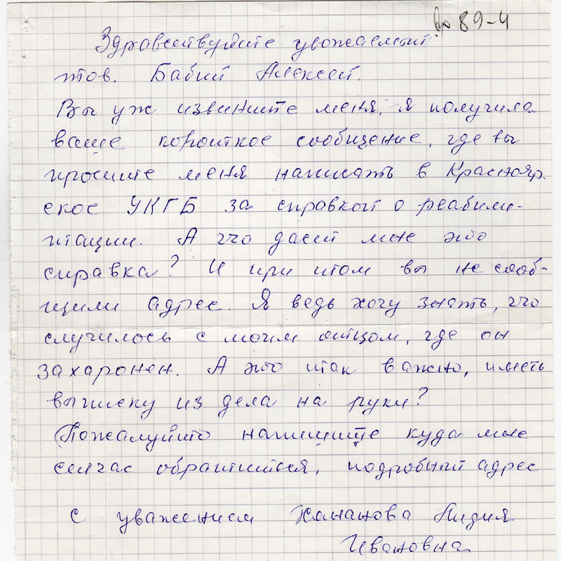 Вы уж извините меня, я получила ваше короткое сообщение, где вы просите меня написать в Красноярское УКГБ за справкой о реабилитации. А что даст мне эта справка? И при этом вы не сообщили адрес. Я ведь хочу знать, что случилось с моим отцом, где он похоронен. А это так важно, иметь выписку из дела на руки?