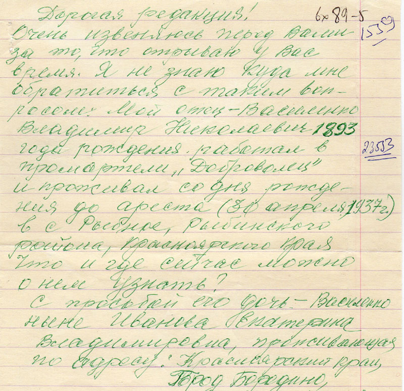 Очень извеняюсь перед Вами за то, что отрываю у Вас время. Я не знаю куда мне обратиться с таким вопросом. Мой отец – Василенко Владимир Николаевич 1893 года рождения работал в промартели «Доброволец» и проживал со дня рождения до ареста (30 апреля 1937г.) в с. Рыбное, Рыбинского района, Красноярского края. Что и где сейчас можно о нем узнать?
