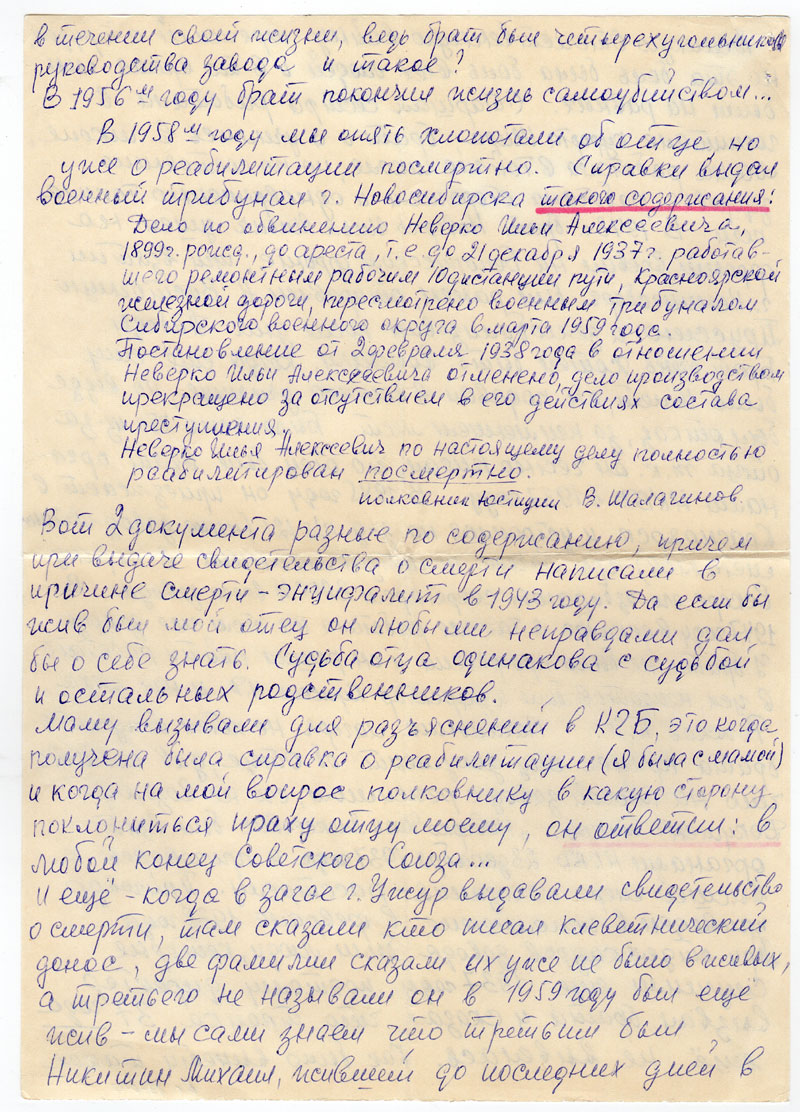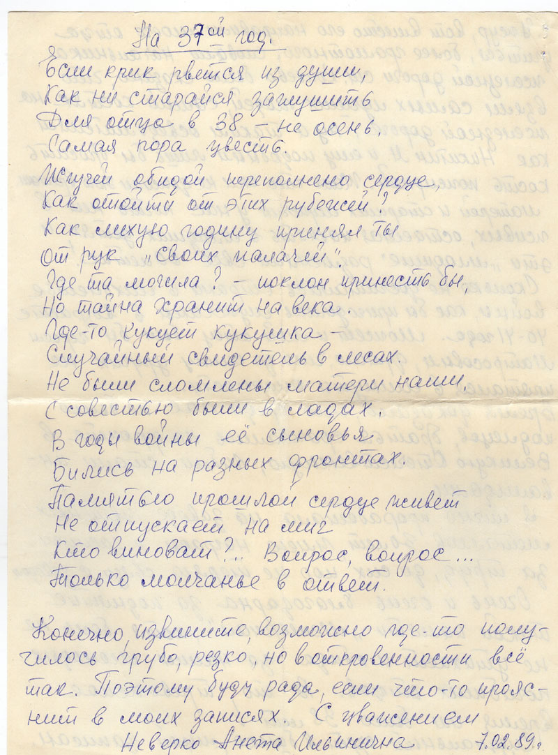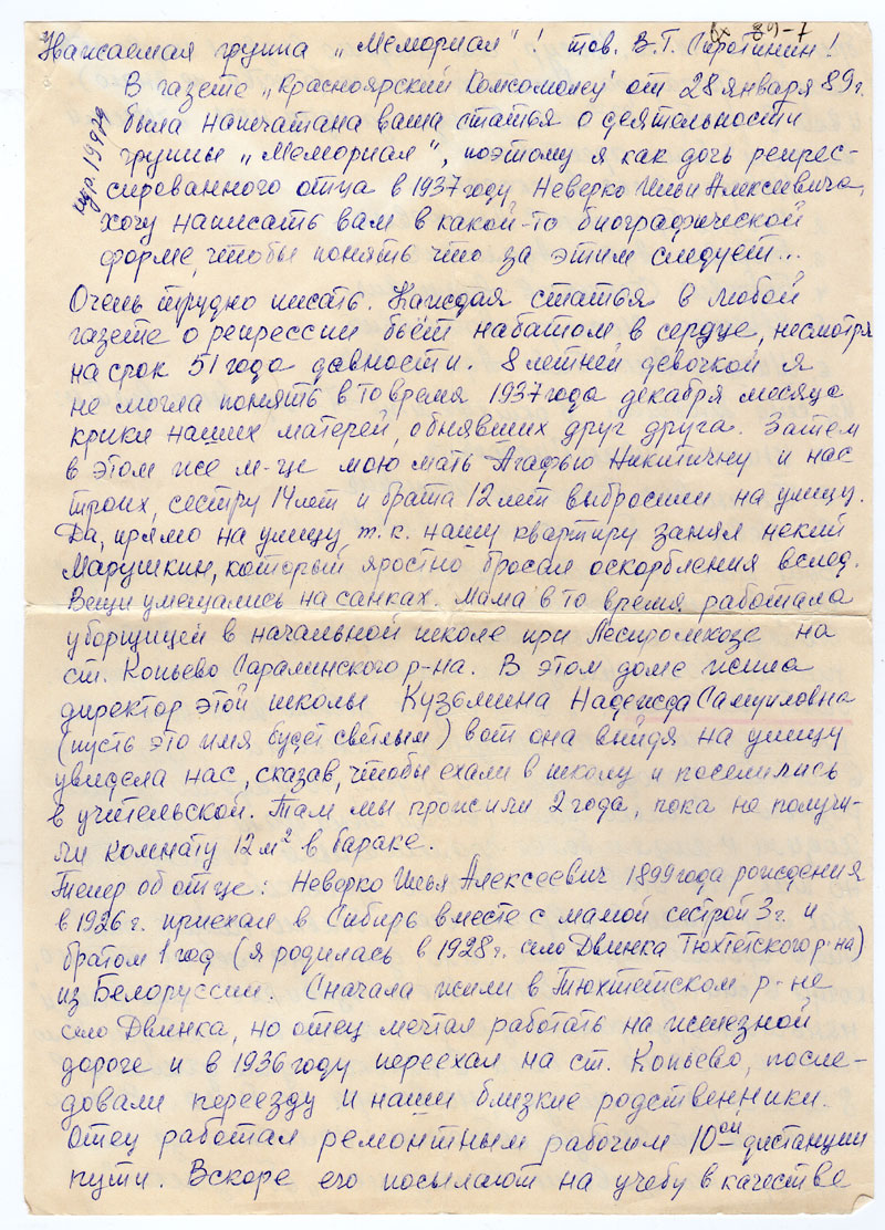 В газете «Красноярский Комсомолец» от 28 января 89 г. была напечатана ваша статья о деятельности группы «Мемориал», поэтому я как дочь репрессированного отца в 1937 году Неверко Ильи Алексеевича, хочу написать вам в какой-то биографической форме, чтобы понять что за этим следует…