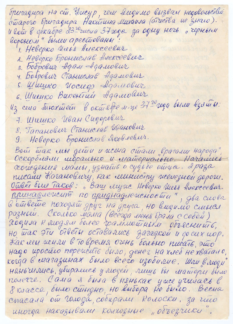 Вот так мы дети и жена стали врагами народа. Оскорбляли морально и материально. Начались хождения мамы, узнать о судьбе отца. 2 раза писали Кагановичу, как министру железной дороги. Ответ был таков: «Ваш муж Неверко Илья Алексеевич принадлежит по приднадлежности», два слова в ответе походят друг на друга, но видимо смысл разный. Сколько мама (всегда меня брала с собой) ходила к людям более грамотным объяснить, но так эти ответы оставались загадкой и до сих пор. Как мы жили в то время очень больно писать. это надо просто пережить было, денег на хлеб не хватало, когда в магазинах было всего изобилие. Шли «в люди», няньчились, убирались у людей, лишь бы матери было полегче. Сама я была в няньках уже училась в 8 классе, было стыдно, но выбора не было. Весна спасала от голода, собирали колоски, за что иногда наказывали колхозные «объезчики».