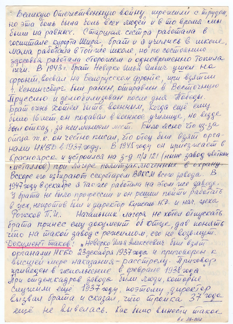 Брат очень хотел быть военным, когда ещё ему было 16 лет он подавал в военное училище, но везде был отказ, за неимением мест. Было ясно что из-за отца т.к. он честно писал, что отец был взят органами НКВД в 1937 г. В 1945 г. он приезжает в Красноярск и устроился на з-д п/я 121 (ныне завод цветных металлов) при лагере политзаключенных в охрану. Вскоре его избирают секретарем ВЛКСМ всего завода. В 1947 г. в декабре я так же работала на этом же заводе. У брата не было профессии и он решил пойти работать в цех, непротив был и директор Кужель Н.Д. и нач. цеха Рожков П.И.. Начальник лагеря не хотел отпускать брата принес ему документ об отце, дав понять что на такой завод с режимом, его не возьмут. Документ таков: «Неверко Илья Алексеевич был взят органами НКВД 23 декабря 1937 года и приговорен к высшей мере наказания – расстрелу. Приговор приведен в исполнение в феврале 1938 года» При отделе кадров завода были люди, которые служили еще 1937 году, поэтому директор вызвал брата и сказал, что тройка 1937года еще не вывелась. Как было вынести такое в течении своей жизни, ведь брат был четырехугольников руководства завода и такое?