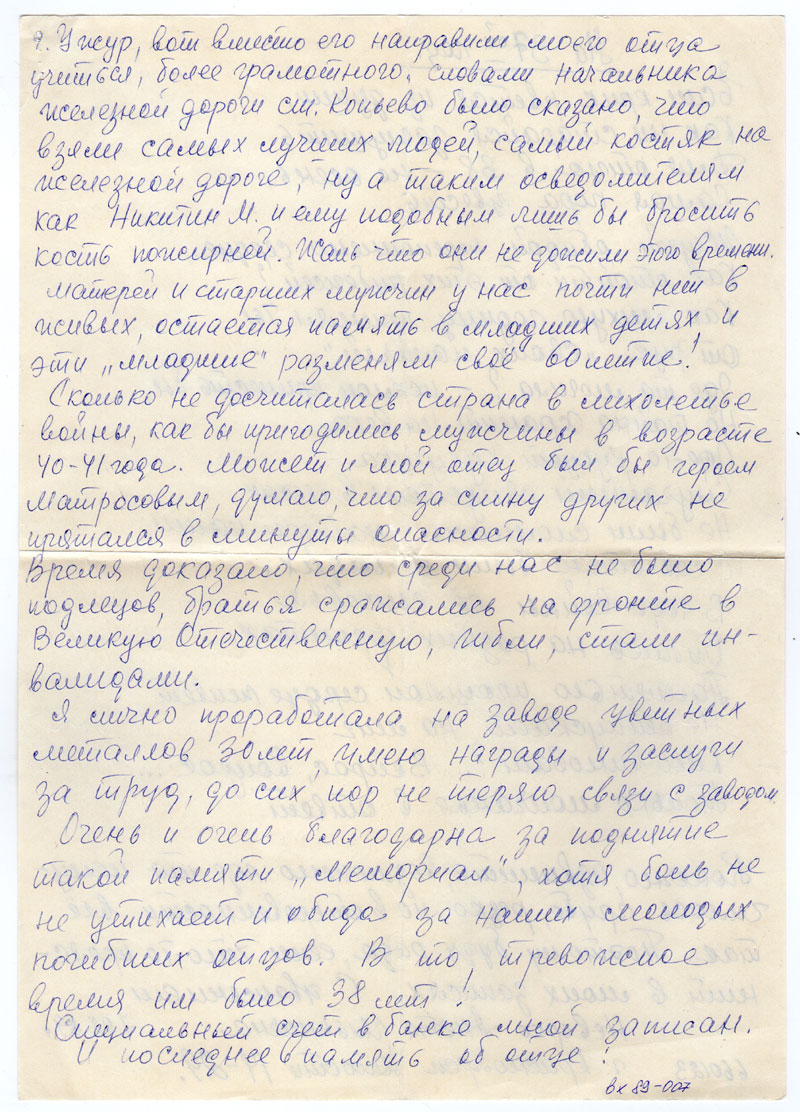 И ещё – когда в загсе г. Ужур выдавали свидетельство о смерти, там сказали кто писал клеветнический донос, две фамилии сказали их уже не было в живых, а третьего не называли он в 1959 году был ещё жив – мы сами знаем что третьим был Никитин Михаил, живший до последних дней в г. Ужур, вот вместо его направили моего отца учиться, более грамотного. Словами начальника железной дороги ст. Копьево было сказано, что взяли самых лучших людей, самый костяк на железной дороге. Ну а таким осведомителям как Никитин М. и ему подобным лишь бы бросить кость пожирней. Жаль что они не дожили этого времени. Матерей и старших мужчин у нас почти нет в живых, остается память в младших детях и эти «младшие» разменяли свое 60 летие!