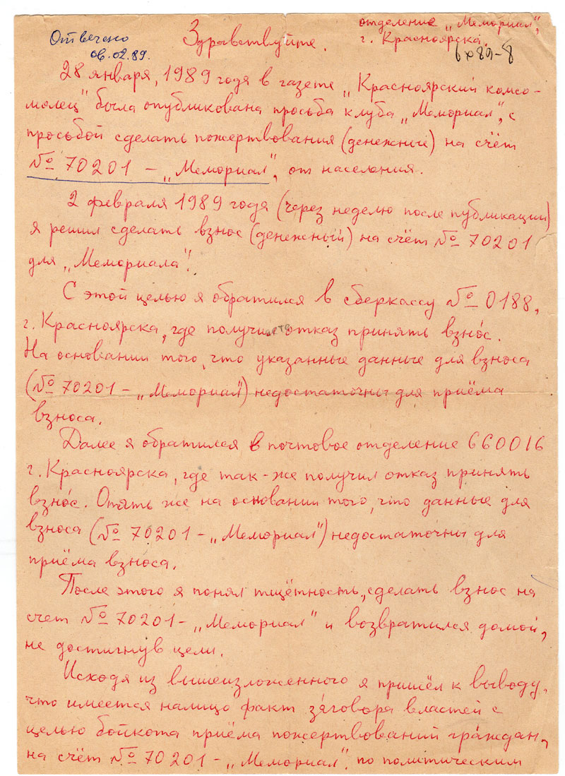 2 февраля 1989 года (через неделю после публикации) я решил сделать взнос (денежный) на счет №70201 для «Мемориала».