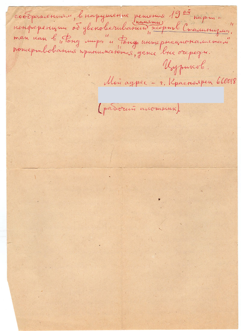 Исходя из вышеизложенного, я пришёл к выводу, что имеется налицо факт заговора властей с целью бойкота приёма пожертвования граждан, на счёт № 70201 – «Мемориал» по политическим соображениям, в нарушение 19ой парт-конференции об увековечивании памяти «жертв Сталинизма», так как «Фонд мира» и «Фонды интернационалистам» пожертвования принимаются, даже вне очереди.