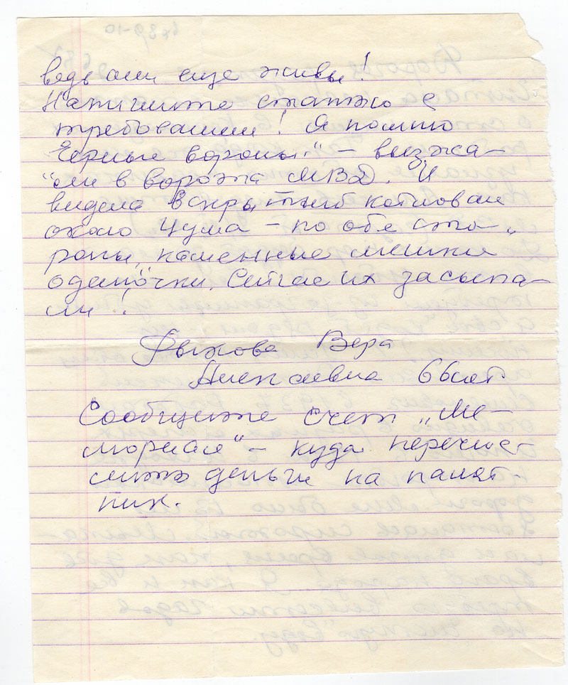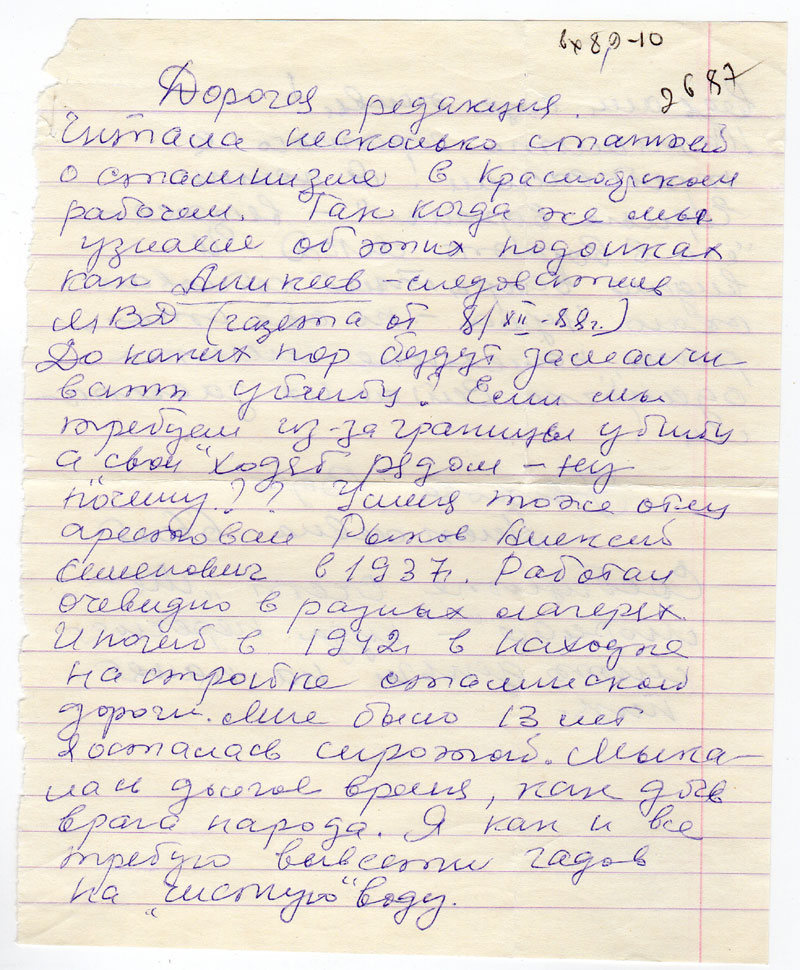 Читала несколько статей о сталинизме в Красноярском рабочем. Так когда же мы узнаем об этих подонках как Аникеев – следователь МВД (газета от 8/XII – 88 г.). До каких пор будут замалчивать убийц? Если мы требуем из-за границы убийц а «свои» ходят рядом - ну почему?? У меня тоже отец арестован Рыков Алексей Семенович в 1937 г. Работал очевидно в разных лагерях. И погиб в 1942 в Находке на стройке сталинской дороги. Мне было 13 лет Я осталась сиротой. Мыкалась долгое время, как дочь врага народа. Я как и все требую вывести гадов на «чистую» воду.