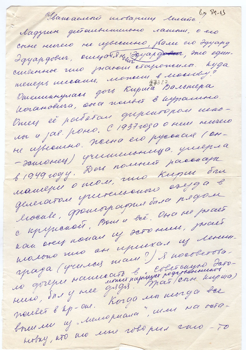 Откликнулась дочь Кирша Вольтера Иогановича. Она живет в Курагино. Отец ее работал директором школы и зав. роно. С 1937 г. о нем ничего неизвестно, жена его русская, он эстонец, учительница, умерла в 1949 г.