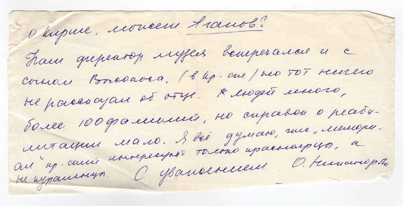 Наш директор музея встречался и с сыном Высокоса (в Кр-ке), но тот ничего не рассказал об отце. Людей много, около 100 фамилий, но справок о реабилитации мало. Я все думаю, что «Мемориал» Красноярский интересуют только красноярцы, а не Курагинцы.