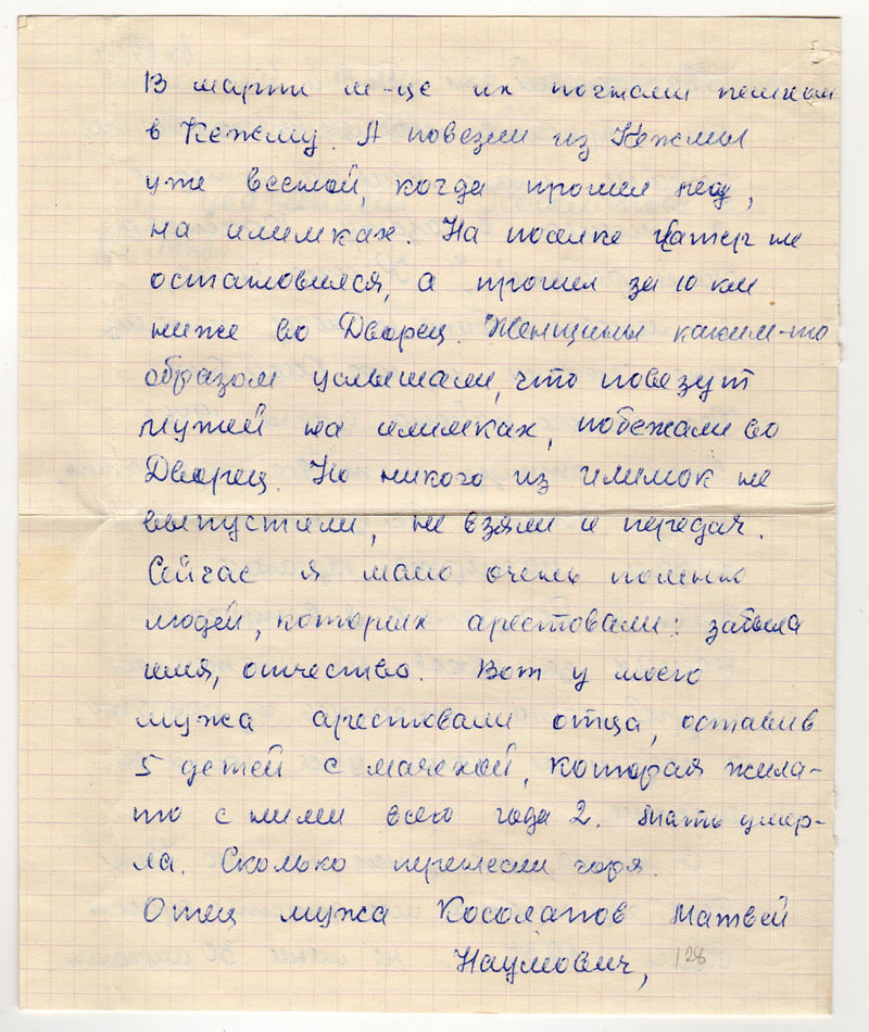 Я писала, что у нас на пос. Косой Бык, где прошло мое детство, арестовали 1937 г не менее 30 мужчин. В марте м-це их погнали пешком в Кежму. А повезли из Кежмы уже весной, когда прошел лед, на илимках. На поселке катер не остановился, а прошел за 10 км. ниже во Дворец. Женщины каким-то образом услышали, что повезут мужей на илимках, побежали во Дворец. Но никого из илимок не выпустили, не взяли и передач. Сейчас я мало очень помню людей, которых арестовали: забыла имя, отчество. Вот у моего мужа арестовали отца, оставив 5 детей с мачехой, которая жила-то с ними всего года 2. Мать умерла. Сколько перенесли горя. Отец мужа Косолапов Матвей Наумович, братья его:Косолапов Семен Наумович, Косолапов Алексей Наумович, Косолапов Василий Наумович. Наши соседи: Панов Иосиф Игнатьевич, его отец Панов Игнатий Федорович, Парфенов Иван …, отец и сын Забродины, Бабенчук , Барабаш , Лопатин. Жива жена Панова Иосифа И, живет в пос. Болтурино с дочкой, это 10 км от Косого Быка, она хорошо помнит об этом. Но съездить надо летом. А д. Стрелка находится в устье Ангары: с одной стороны берег омывается Енисеем, а со второй Ангарой. Вот и называется стрелкой. Вниз по течению Енисея – Лесосибирск, Енисейск.