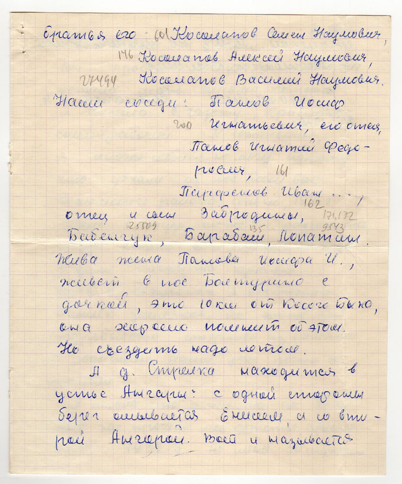 Вы просите сообщить некоторые детали моего письма, которое я писала в газету «Красноярский рабочий». К сожалению, я многое сообщить не могу, потому что уехали из пос. Косой Бык Кежемского района давно, 1946 г. Люди оттуда тоже все разъехались, когда стали объединять колхозы и дали паспорта кулакам. Здесь в Богучанах я встречала наших земляков, но тоже уже подробности стерлись из памяти, а родители наши уже почти все умерли.