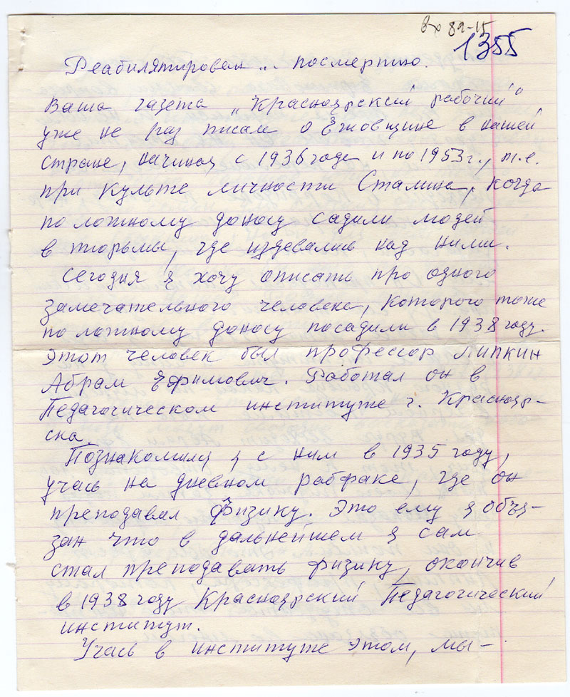 Ваша газета «Красноярский рабочий» уже не раз писале о Ежовщине в нашей стране, начиная с 1936 года и по 1953 г., т.е. при культе личности Сталина, когда по ложному доносу садили людей в тюрьмы, где издевались над ними. Сегодня я хочу описать про одного замечательного человека, которого тоже по ложному доносу посадили в 1938 году. Этот человек был профессор Липкин Абрам Ефимович. Работал он в Педагогическом институте г. Красноярска.