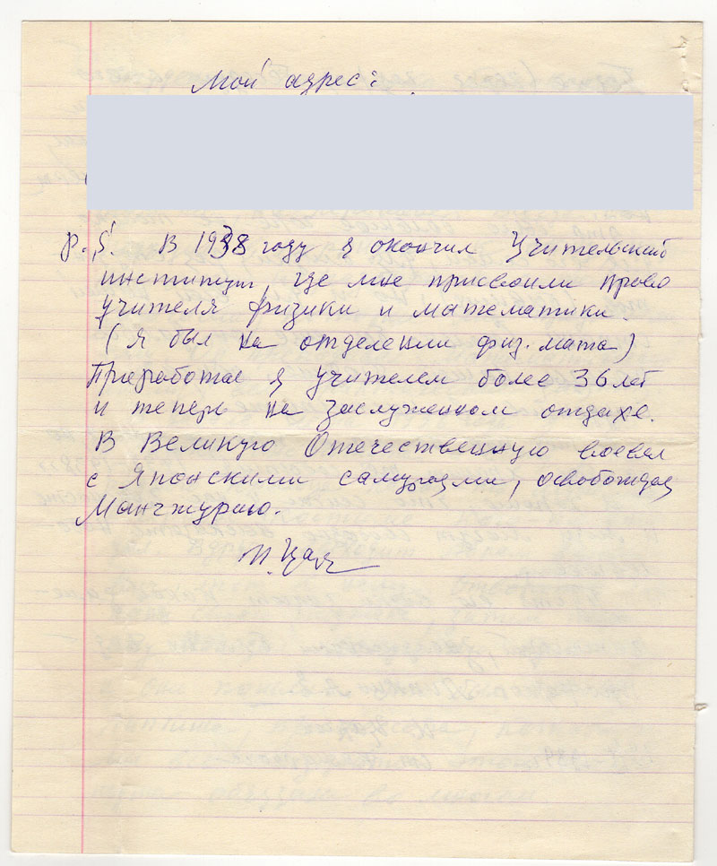 Познакомился с ним в 1935 году, учась на дневном рабфаке, где он преподавал физику. Это ему я объязан что в дальнейшем я сам стал преподавать физику, окончив в 1938 году Красноярский Педагогический институт.