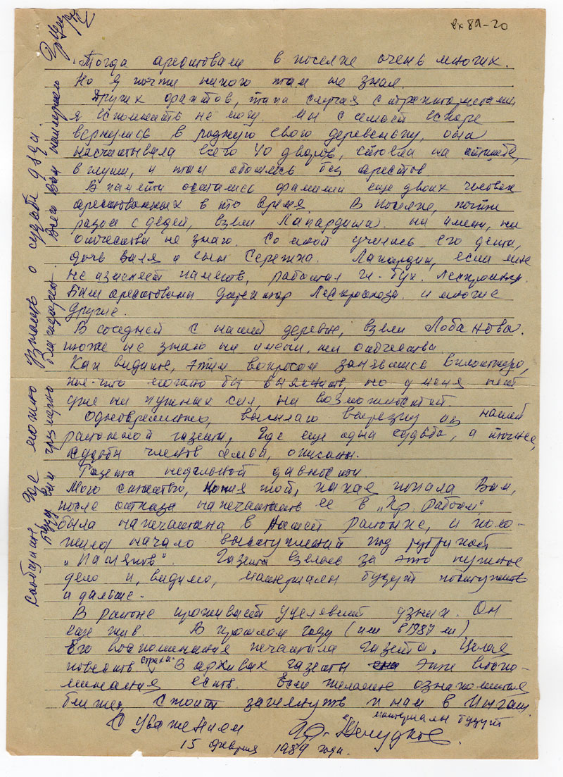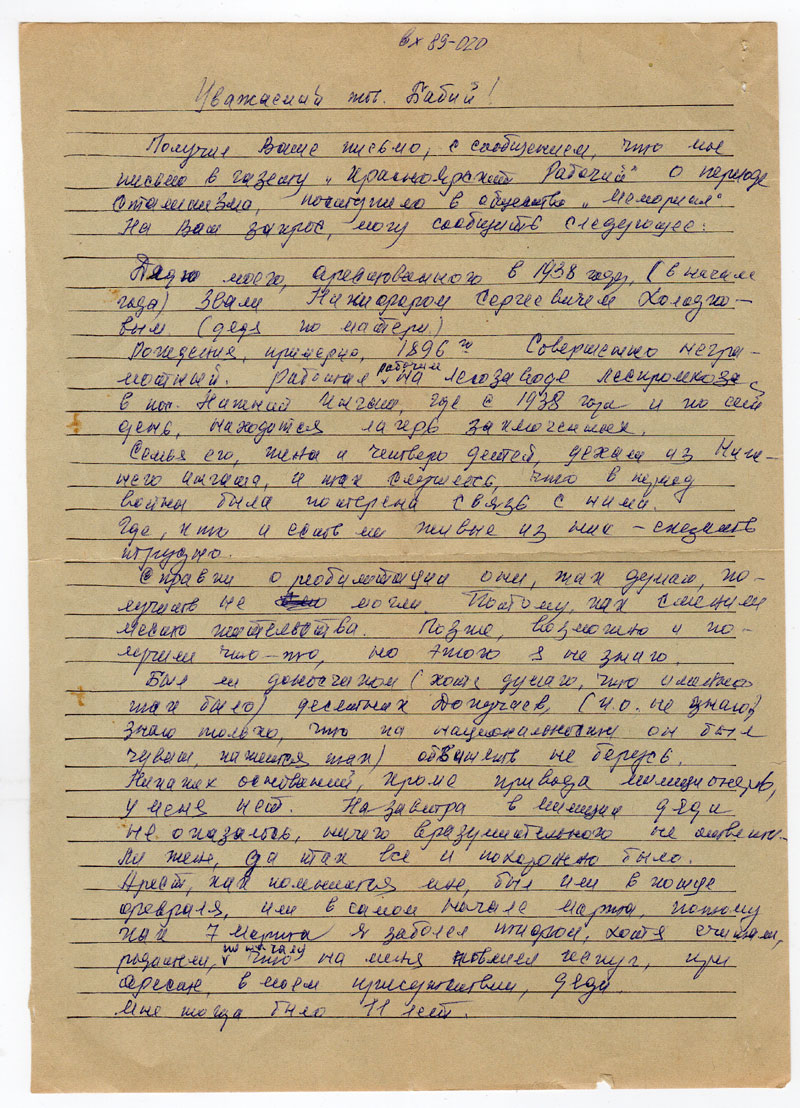 Получил Ваше письмо, с сообщением, что мое письмо в газету «Красноярский Рабочий» о периоде сталинизма, поступило в общество «Мемориал»