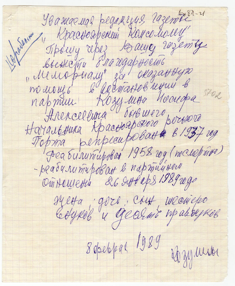 Прошу через Вашу газету вынести благодарность «Мемориалу» за оказанную помощь в востановлении в партии Козулина Иосифа Алексеевича бывшего Начальника Красноярского речного Порта репресирован в 1937 год