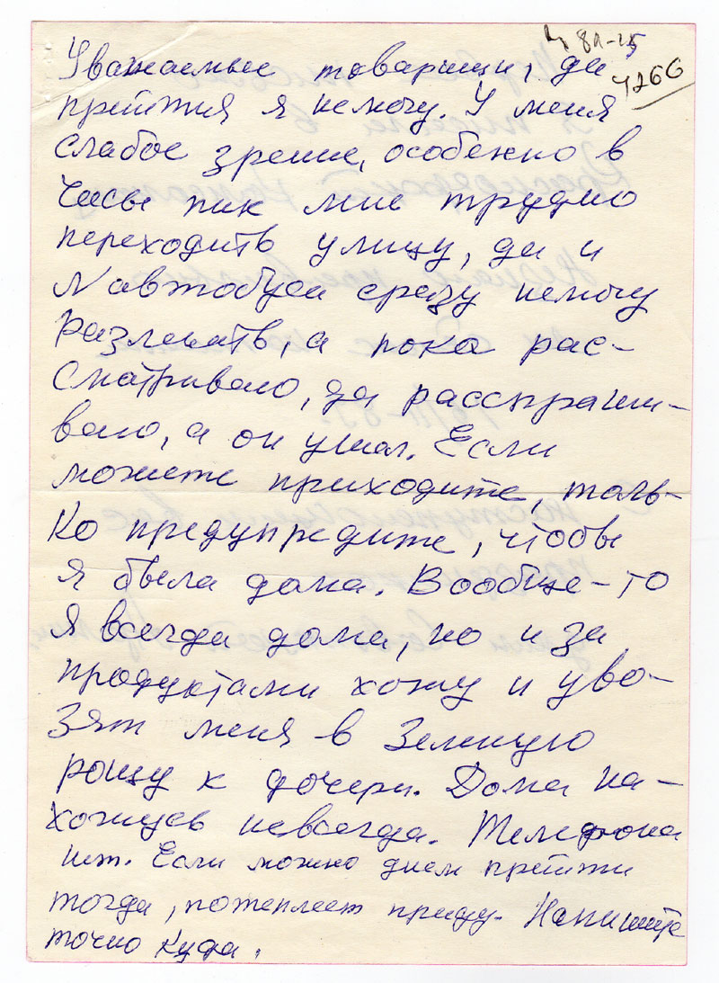 Уважаемые товарищи, да прийти я не могу. У меня слабое зрение, особенно в часы пик мне трудно переходить улицу, да и N автобуса сразу немогу различить, а пока рассматриваю, да расспрашиваю, а он ушел. Если можете, приходите, чтобы я была дана. Вообще-то я всегда дома, но и за продуктами хожу и увозят меня в Зеленую рощу к дочери. Дома нахожусь невсегда. Телефона нет. Если можно днем прийти тогда, потеплеет приду. Напишите точно куда.
