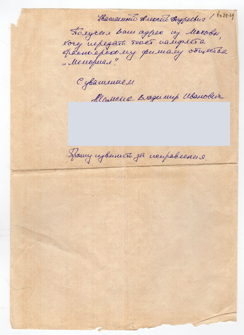 Получил Ваш адрес из Москвы, Хочу передать текст памфлета Красноярскому филиалу общества «Мемориал».