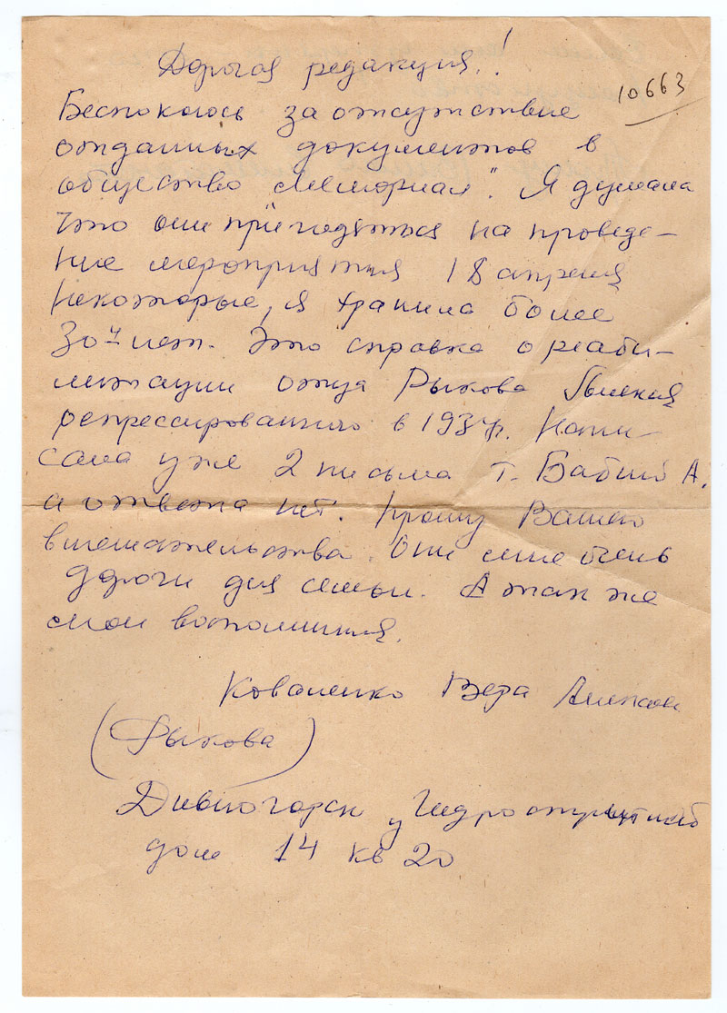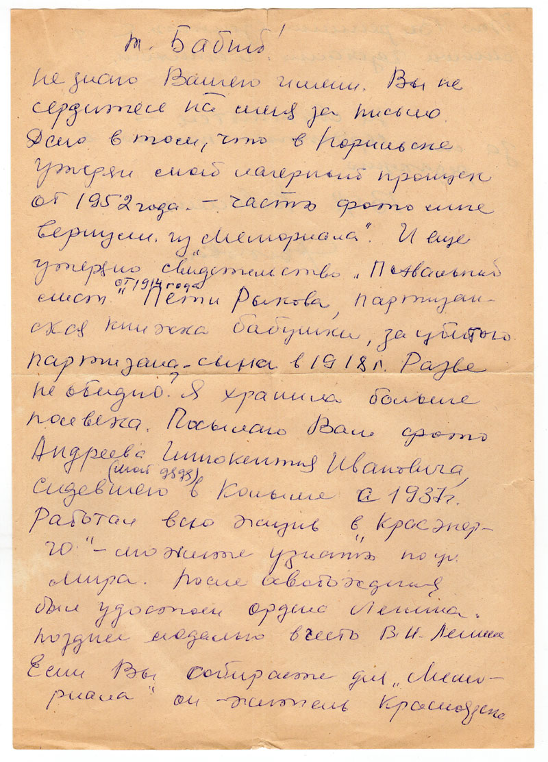 Норильске. Пусть т. Бабий снимет копию. Я ему оставила свои «воспоминания» о