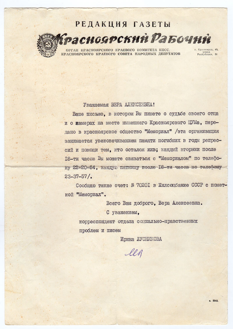 Сообщаю также счет: №70201 в Жилсоцбанке СССР с пометкой «Мемориал».