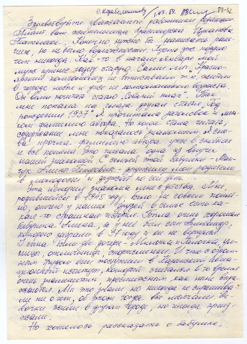 Здравствуйте уважаемые работники редакции. Пишет вам жительница Красноярска Цуканова Татьяна. Конечно, нужно бы написать раньше, но не было возможности. Пусть уж поздно чем никогда. Как-то в начале января мой муж принес газету старую. Сами мы «Красноярский Комсомолец» не выписываем, т.к. жители в городе новые и уже не комсомольского возраста. Он велел почитать статью «Собачий плач». Так мне попала на глаза другая статья «Год рождения 1937». Я прочитала заголовок и мельком фамилию автора. Но когда стала читать, содержание мне показалось знакомым. Я снова прочла фамилию автора уже в скобках и все поняла. Это писала одна из внучек нашей знакомой. С семьей этой бабушки - Манчук Алины Петровны - дружили мои родители в молодости и дружат по сей день.