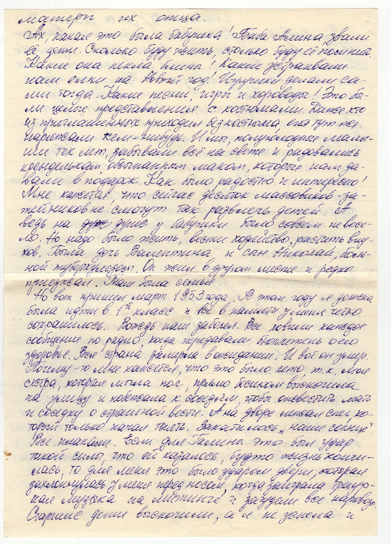 Но вот пришел март 1953 года. В этом году я должна была идти в 1-й класс и все в памяти у меня четко сохранилось. Вождь наш болел. Все ловили каждое сообщение по радио, когда передавали бюллетень о его здоровье. Вся страна замерла в ожидании. И вот он умер. Почему-то мне кажется, что это было лето, т.к. моя сестра, которая мыла пол, прямо босиком выскочила на улицу и побежала к соседям, чтобы оповестить мать и соседку о страшной вести. А на дворе лежал снег, который только начал таять. Закатилось «наше солнце». Все плакали. Если для Галины это был удар такой силы, что ей казалось, будто жизнь кончилась, то для меня это было ударом двери, которая захлопнулась у меня перед носом, когда заиграла траурная музыка на митинге и загудели все паровозы. Старшие дети выскочили, а я не успела и осталась рыдать от тоски в закрытой квартире. Это была разница в 7 лет в нашем возрасте. Ее и мои восприятия случившегося.