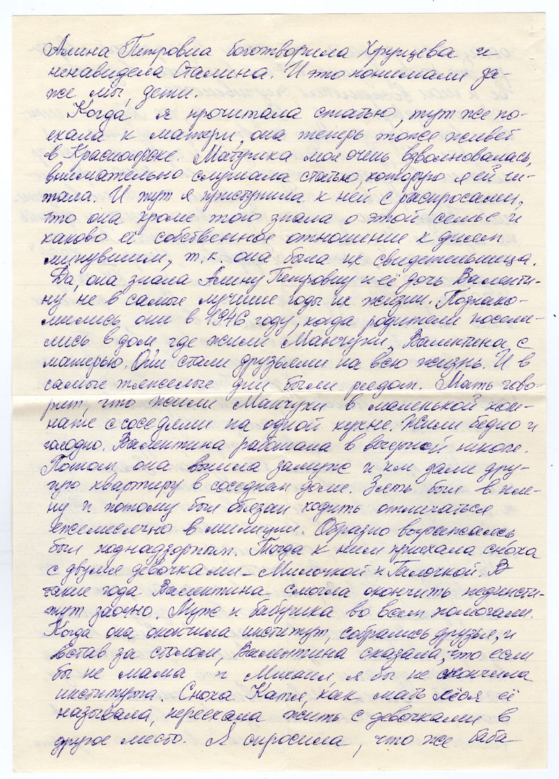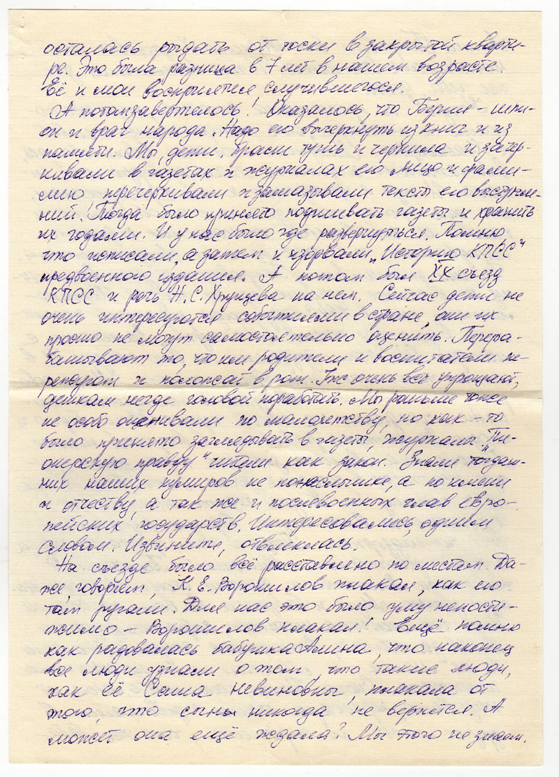 На съезде было все расставлено по местам. Даже, говорят, К.Е. Ворошилов плакал, как его там ругали. Для нас это было уму непостижимо - Ворошилов плакал! Еще помню как радовалась бабушка Алина, что наконец все люди узнали о том, что такие люди, как ее Саша невиновны, плакала от того, что сын никогда не вернется. А может она еще ждала? Мы этого не знаем. Алина Петровна боготворила Хрущева и ненавидела Сталина. И это понимали даже мы, дети.