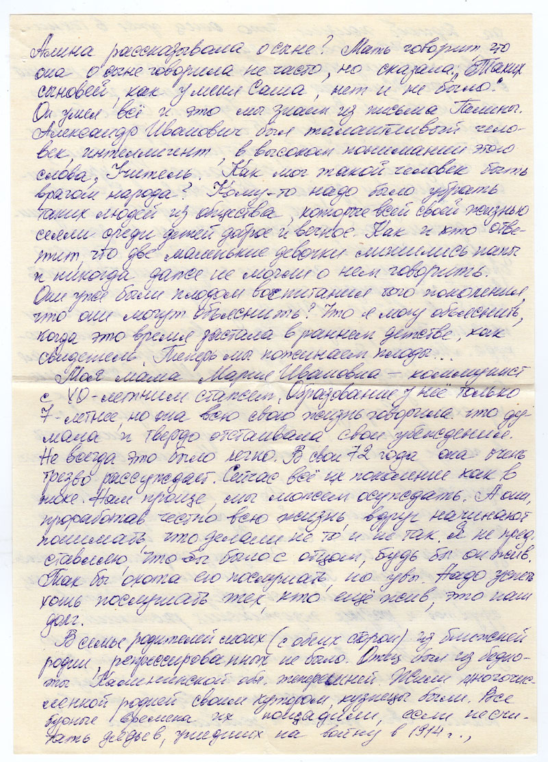 Моя мама Мария Ивановна - коммунист с 40-летним стажем. Образование у нее только 7-летнее, но она всю свою жизнь говорила что думала и твердо отстаивала свои убеждения. Не всегда это было легко. В свои 72 года она очень трезво рассуждает. Сейчас все их поколение как в шоке. Нам проще, мы можем осуждать. А они, проработав честно всю жизнь, вдруг начинают понимать, что делали не то и не так. Я не представляю, что бы было с отцом, будь бы он жив. Так бы охота его послушать, но увы. Надо успеть хоть послушать тех, кто еще жив, это наш долг.