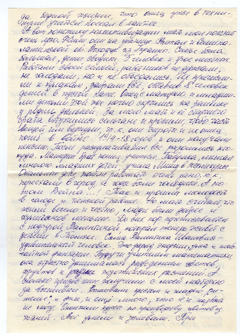 А вот политику коллективизации мать моя помнит очень ярко. Жили они на границе Алтая и Семипалатинской обл. Выходцы из Украины. Семья была большая, дети сводные 5 человек и трое местных. Работали своей семьей, работников не держали, не голодали, но и не объедались. Их причислили к кулакам, забрали все, оставив 8 человек детей в пустой хате. Отец с матерью и младшими детьми это же ночью скрылись на заимке у родни дальней. За мою мать и ее старшего брата вступились сельчане и просили, чтобы часть вещей им вернули, т.к. они сироты и их отец погиб в войне 1914-18 годов и они получали пенсию. После раскулачивания все разошлись кто куда. Материн брат пошел учиться. Бабушка, лишая многого младших детей учила Мишу в техникуме. Остальные дети пошли работать очень рано, т.к. переехали в города, а годы были голодные. А потом Война...! Так и прошла молодость в голоде и тяжкой работе. Но мать считает, что жили весело и честно, люди были добрее и хулиганов меньше. До сих пор переписывается с подругой Валентиной, которая теперь живет с детьми в Томске. Сама Валентина Ивановна - удивительный человек. Это заряд энергии, ума и необычайной фантазии. Будучи учителем математики, она страстно занималась разведением цветов, фруктов и разных экзотических растений. А сколько призов они получили с моей матерью за вышивки. Вышивали крестом и гладью «ришелье», и филе, и еще много, что я назвать не могу. Окончили курсы по производству цветов из тканей. Все умели и успевали. При необходимости Валентина может и "оду" сочинить во славу друзей или куплеты. Все к месту, очень тонко и с юмором. Ее жизнелюбию я иногда поражаюсь. И вот таких людей у нас преследовали годами, хотели их уничтожить. Но видно, этого не выйдет, т.к. земля наша ими богата и богатство это не должно иссякнуть. Извините за такое путаное описание, но хочется понять все происходящее в стране ранее и теперь. О том, что было раньше, надо спросить у современников 30х годов, у очевидцев, а их остается все меньше. А понять их надо, чтобы нам таких ошибок не повторить, они так дорого стоят. Ценой миллионов жизней. Чтобы наши дети правильно учились разбираться в исторических событиях. Это уже другой вопрос, его затрагивать не буду.