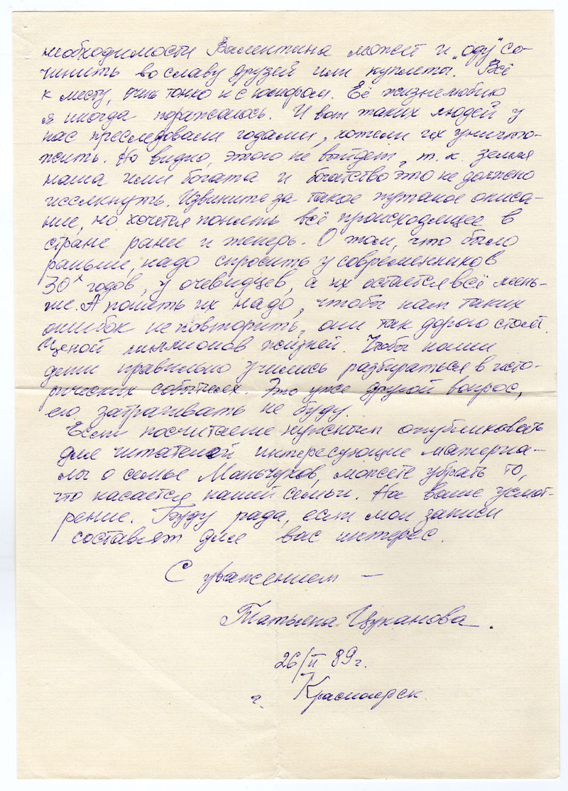 Если посчитаете нужным опубликовать для читателей интересующие материалы о семье Маньчуков, можете убрать то, что касается нашей семьи. На ваше усмотрение. Буду рада, если мои записи составят для вас интерес.