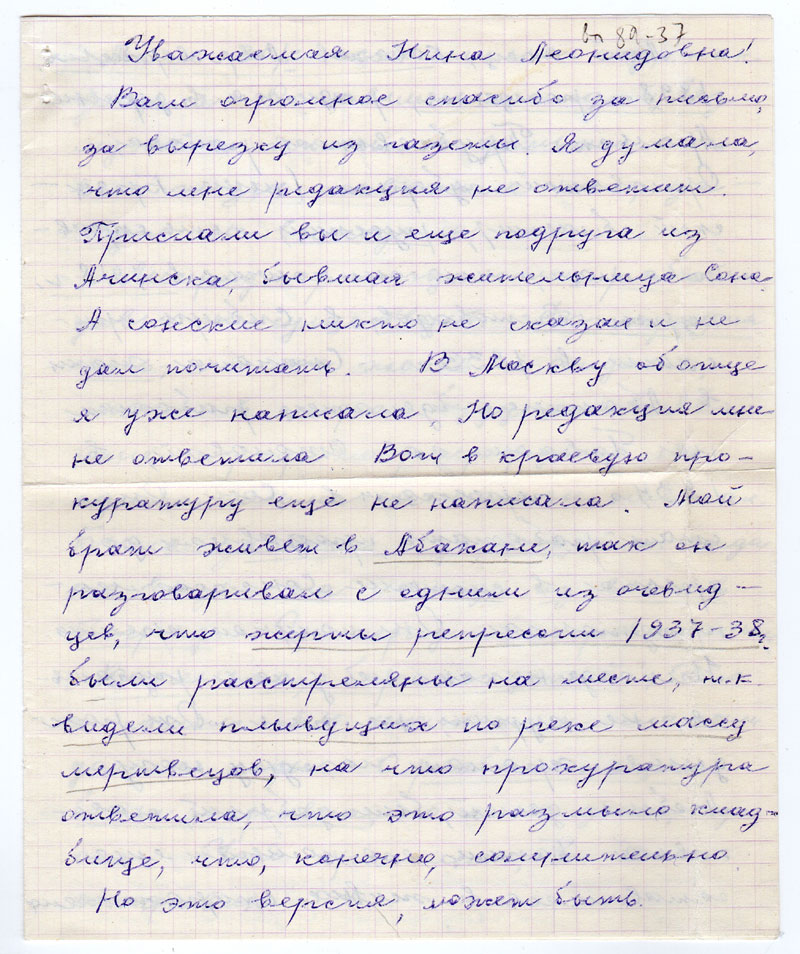 Вам огромное спасибо за письмо, за вырезку из газеты. Я думала, что мне редакция не ответит. Прислали вы и еще подруга из Ачинска, бывшая жительница ст. Сон. А сонские никто не сказал и не дал почитать. В Москву об отце я уже написала. Но редакция мне не ответила. Вот в краевую прокуратуру еще не написала. Мой брат живет в Абакане, так он разговаривал с одним из очевидцев, что жертвы репрессии 1937-38 г. были расстреляны на месте, т.к. видели плывущих по реке массу мертвецов, на что прокуратура ответила, что это размыло кладбище, что конечно, сомнительно.