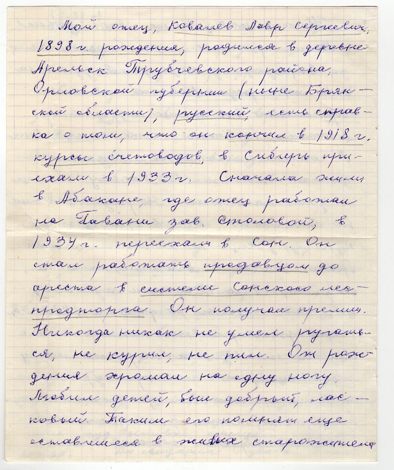 Мой отец, Ковалев Лавр Сергеевич, 1898 г. рождения, родился в деревне Арельск Трубчевского района Орловской губернии (ныне Брянской области), русский, есть справка о том, что он кончил в 1918 г. курсы счетоводов, в Сибирь приехали в 1933 г. Сначала жили в Абакане, где отец работал на Гавани зав. столовой, в 1934 г. переехали в Сон. Он стал работать продавцом до ареста в системе Сонского леспродторга. Он получал премии. Никогда никак не умел ругаться, не курил, не пил. От рождения хромал на одну ногу. Любил детей, был добрый, ласковый. Таким его помнят еще оставшиеся в живых старожители.