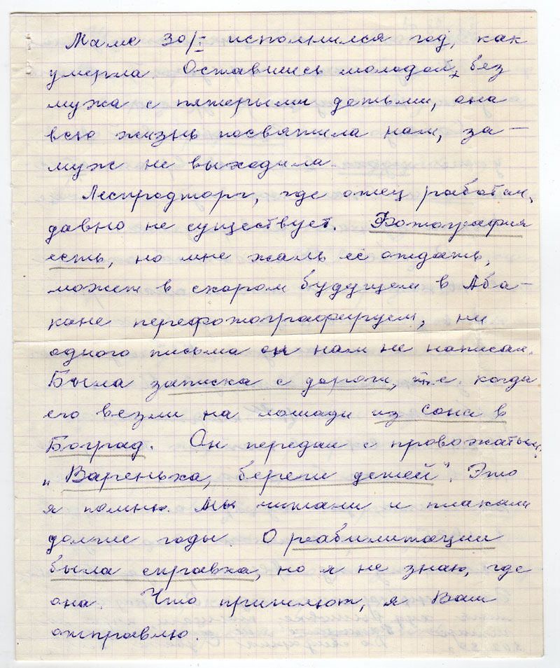 Леспромторг, где отец работал, давно не существует. Фотография есть, но мне жаль её отдать, может в скором будущем в Абакане перефотографируем, ни одного письма он нам не написал. Была записка с дороги, т.е. когда его везли на лошади из Сона в Боград. Он передал с провожатым: «Варенька, береги детей». Это я помню. Мы читали и плакали долгие годы. О реабилитации была справка, но я не знаю, где она. Что пришлют, я Вам отправлю.