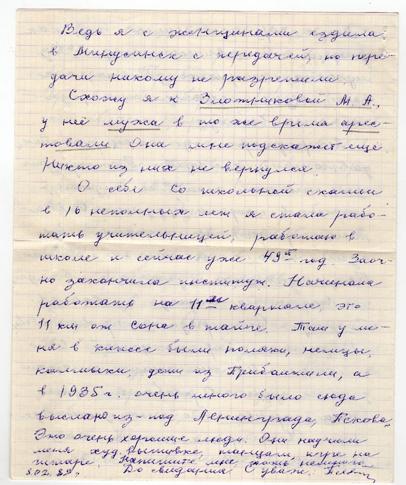 О себе со школьной скамьи в 16 неполных лет я стала работать учительницей, работаю в школе и сейчас уже 49-й год. Заочно закончила институт. Начинала работать на 11-м квартале, это 11 км от Сона в тайге. Там у меня в классе были поляки, немцы, калмыки, дети из Прибалтики, а в 1935 г. очень много было сюда выслано из-под Ленинграда, Пскова. Это очень хорошие люди. Они научили меня худ. вышивке, танцам, игре на гитаре. Напишите мне хоть немнога. До свидания.