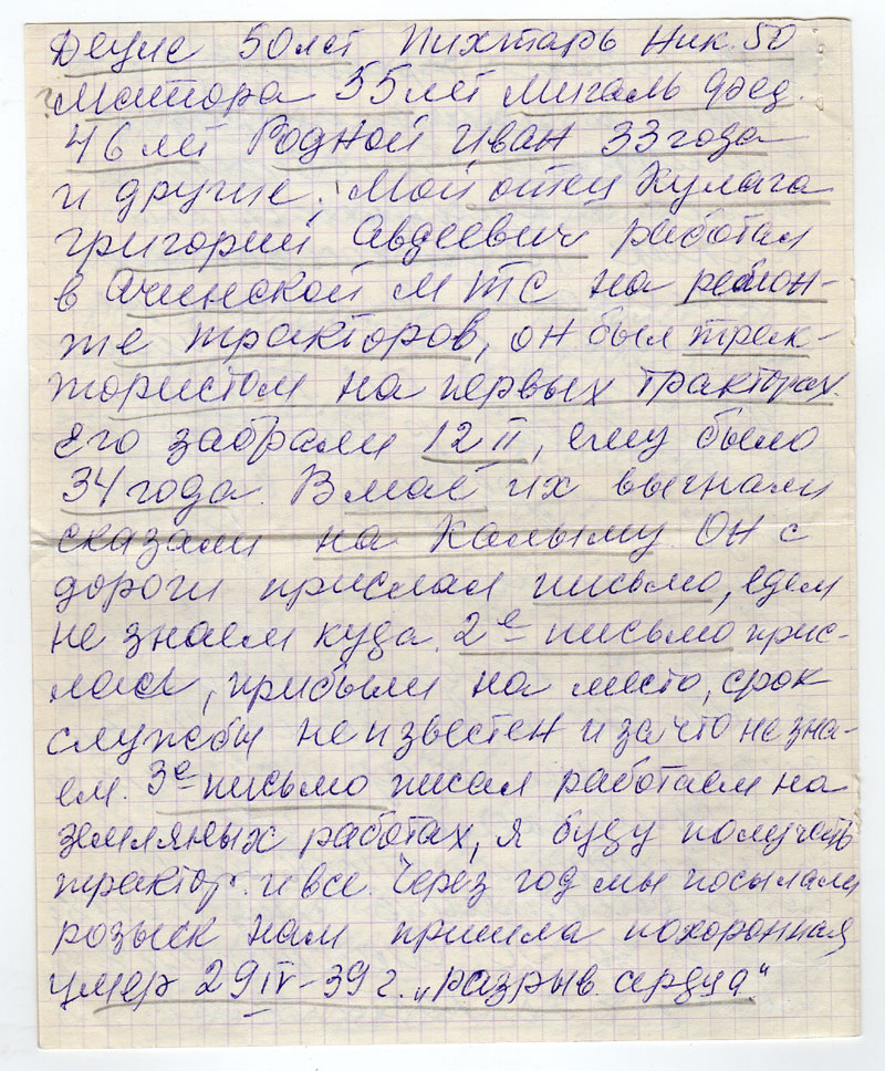 Долго я слушала радио, смотрела телевизор, читала о культеличности. Никак не отчаивалась написать. И все же решилась. Вот что я помню. Я родилась в с. Тимонино Ачинского р-на Красн. кр. В 1938 г. 11 февраля вечером вызвали в с/сов моего дедушку Кулага Авдея Дм. Ему было 54 г. и он больше не вернулся из с/с. Когда мы смотрели в окно с/с там было 10 чел. Сидели на полу их никуда не выпускали и увезли в Ачинскую тюрьму. Самые работящие люди от 18-и лет и до 50 Симоновские 2 брата Ивану 33 г. Косте 18 лет, Деуле 50 лет, Пихтарь Ник. 50 лет, Мотора 55 лет, Мигаль Фед. 46, лет Родной Иван 33 года и другие.