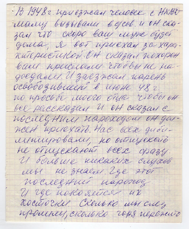 В 1948 г. приезжал человек с НКВД маму вызывали в с/сов. и он сказал что скоро ваш муж будет дома, я вот приехал за характеристикой. Он сказал похорон вам прислали чтоб вы не надоедали. И заезжал парень освободивший в июне 48 г. по просьбе моего отца чтобы он все рассказал. И он сказал с последним пароходом он должен приехать. Нас всех дибилитировали, но отпускать не отпускают всех сразу. И больше никаких слухов мы не знаем. Где этот последний пароход. И где покоятся их косточки. Сколько мы слез пролили, сколько горя пережито это не опишешь все.