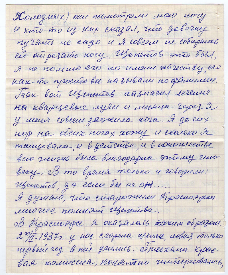 Меня привезли из Кемчугского дет. дома. В какой больнице я лежала не помню, потому что я не ходила. Как говорили у меня гнила нога с большого пальца, бинты и вата прилипала к больным местам. Я очень кричала когда отдирали бинты и меня стращали, что отрежут ногу. Потом я вообще не стала ни кого подпускать к себе, кричала, плакала, уходите без вас завтра заживет. Сколько прошло времени не знаю, но однажды в палату зашли 2 врача мужчины: (после их ухода я услышала, что был Щепетов и Холодных) они посмотрели мою ногу и кто-то из них сказал, что девочку пугать не надо и я совсем не собираюсь ей отрезать ногу. Щепетов это был, я не помню его по имени отчеству, его как-то просто все называли по фамилии. Так вот Щепетов назначил лечение на кварцевые лучи и месяца через 2 у меня совсем зажила нога. Я до сих пор на обеих ногах хожу и сколько я танцевала, и в детстве, и в юношестве всю жизнь была благодарна этому человеку. В то время только и говорили: Щепетов, да если бы не он…