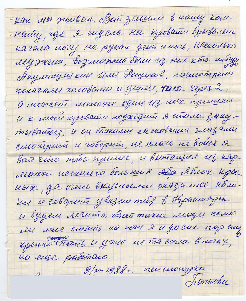 9/XII-1988 г. пенсионерка Попкова