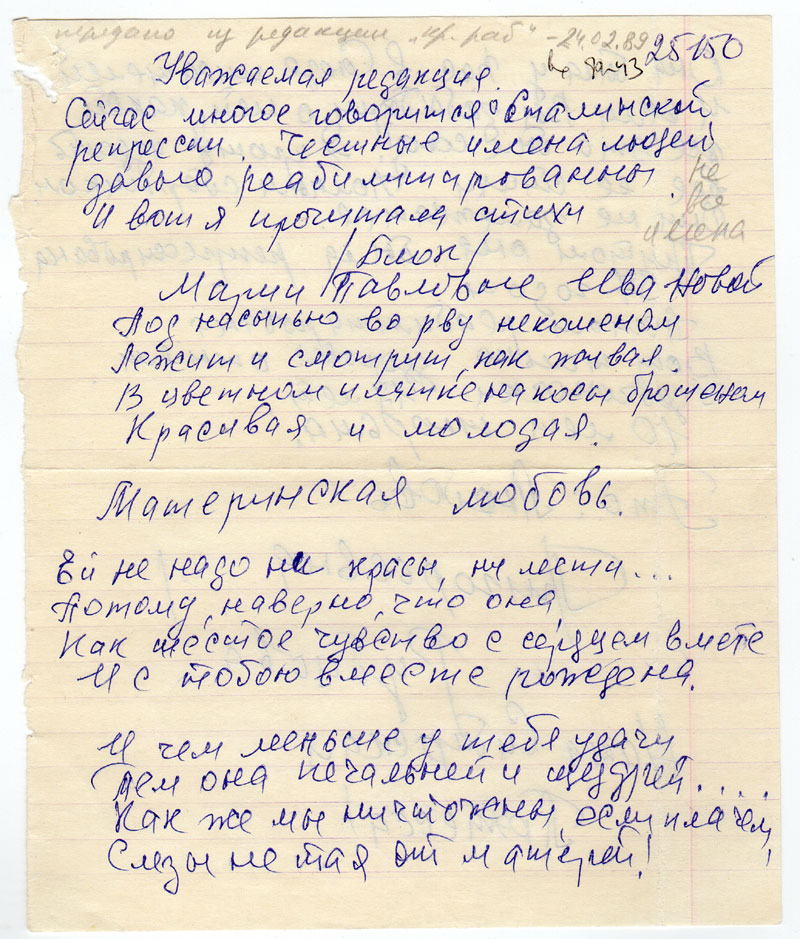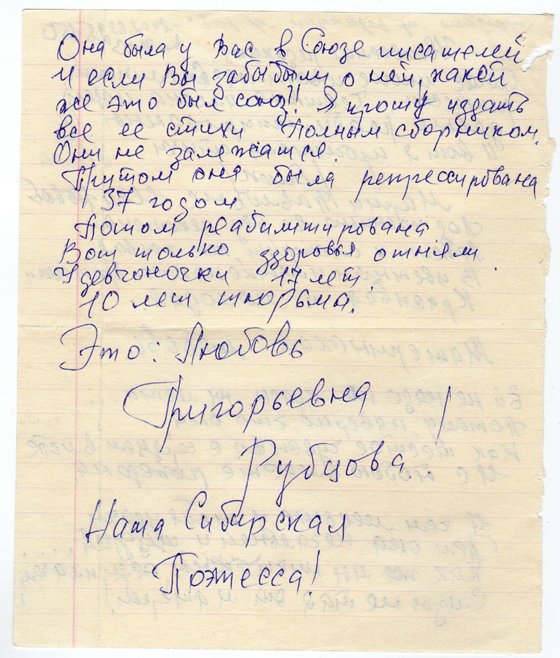 Она была у Вас в Союзе писателей и если Вы забыли о ней, какой же это был союз?! Я прошу издать все ее стихи Полным сборником. Они не залежатся. При том она была репрессирована 37 годом. Потом реабилитирована. Вот только здоровье отняли. У девчоночки 17 лет. 10 лет тюрьма.