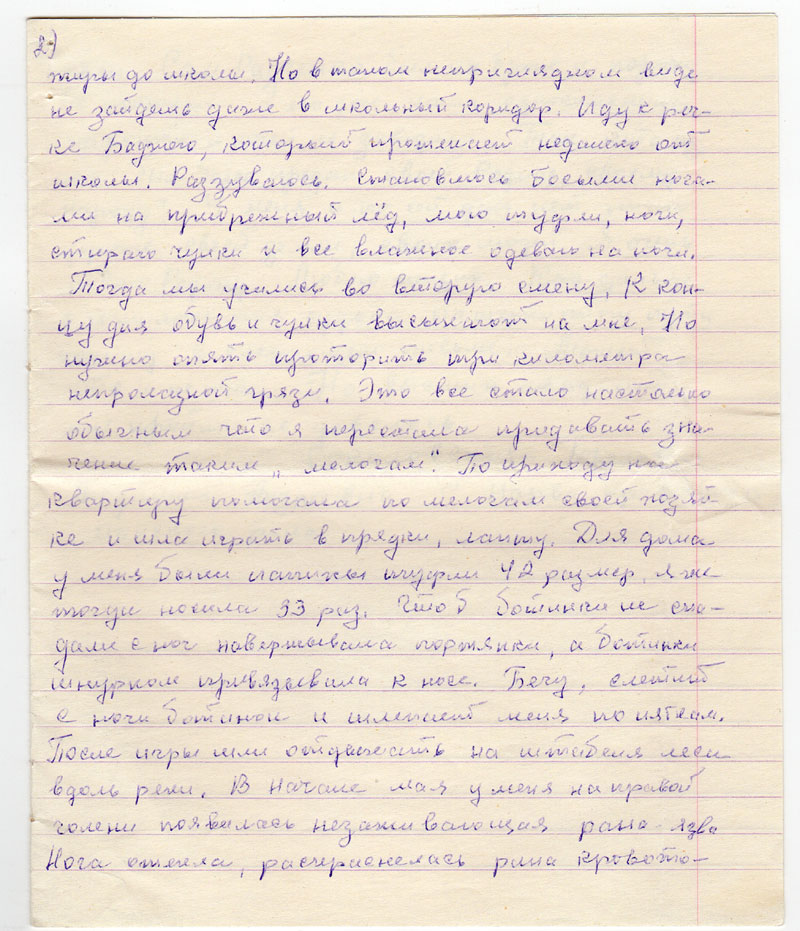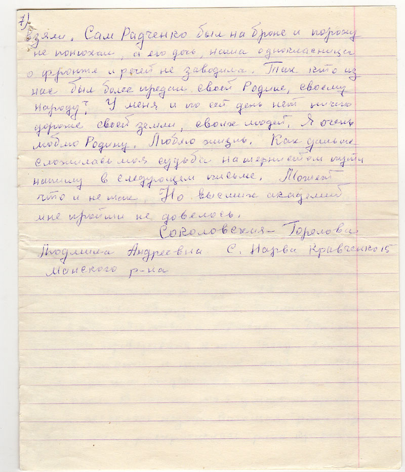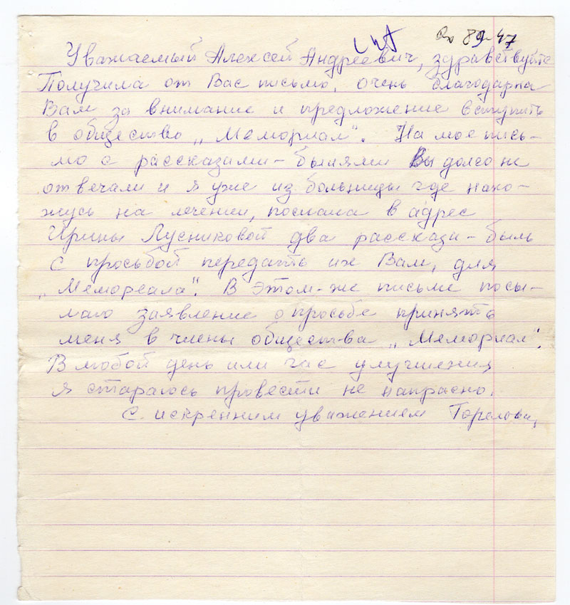 Получила от Вас письмо, очень благодарна Вам за внимание и предложение вступить в общество «Мемориал». На моё письмо с рассказами-былями Вы долго не отвечали и я уже из больницы где нахожусь на лечении, послала в адрес Ирины Лусниковой два рассказа-быль с просьбой передать их Вам, для «Мемориала». В этом же письме посылаю заявление о просьбе принять меня в члены общества «Мемориал». В любой день или час улучшения я стараюсь провести не напрасно.