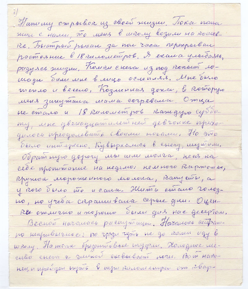 Напишу отрывок из своей жизни. Пока папа жил с нами, то меня в школу возили на кошевке. Быстрый рысак за пол часа перекрывал ростояние в 18 километров. Я ехала улыбаясь, радуясь жизни. Комки снега из-под копыт лошади били мне в лицо ослепляя. Мне было тепло и весело. Козлинная дока, в которую меня закутала мама согревала. Отца не стало и 18 километров каждую субботу, мне двенадцатилетней девчонке приходилось преодолевать своими ногами. Но это было интересно. Кувыркаясь в снегу, шутили. Обратную дорогу мы шли молча, неся на себе пропитание на неделю немного картошки, кружок мороженного молока, капусты, а у кого было то и сала. Жить стало голодно, но учёба скрашивала серые дни. Оценки отлично и хорошо были для нас десертом.