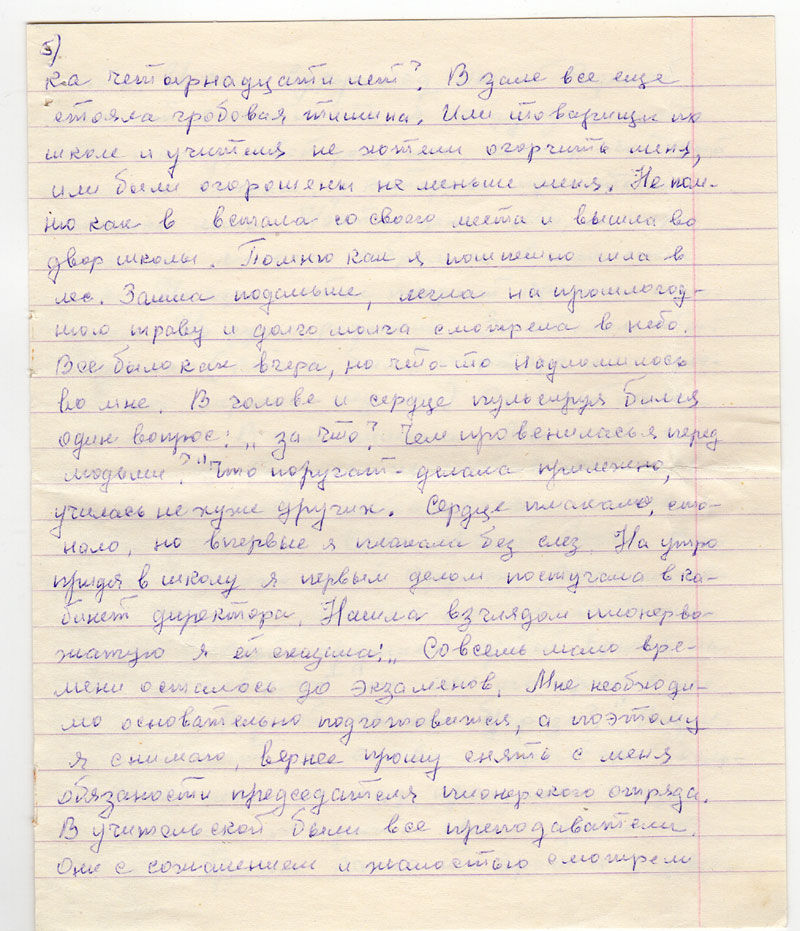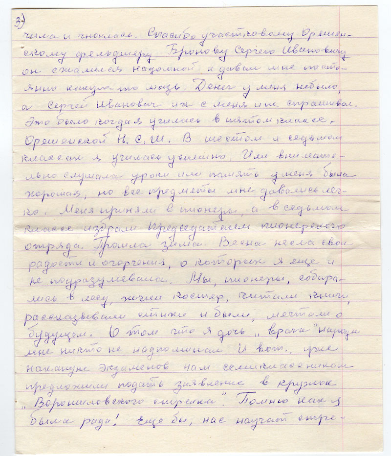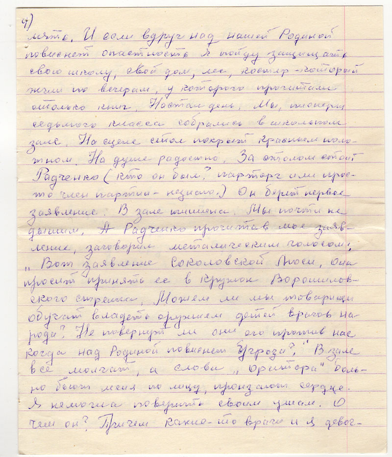 Весной началась распутица. Началось страшно непривычное: по грязи чуть ли не до колен иду в школу. На ногах брезентовые туфли. Холодное месиво снега с глиной сковывает ноги. Вот наконец пройден путь в три километра от квартиры до школы. Но в таком неприглядном виде не зайдёшь даже в школьный коридор. Иду к речке Баджего, который протекает недалеко от школы. Раззуваюсь, становлюсь босыми ногами на прибрежный лёд, мою туфли, ноги, стираю чулки и всё влажное одеваю на ноги. Тогда мы учились во вторую смену, к концу дня обувь и чулки высыхают на мне. Но нужно опять проторить три километра непролазной грязи. Это всё стало настолько обычным что я перестала придавать значение таким «мелочам». По приходу на квартиру помогала по мелочам своей хозяйке и шла играть в прядки, в лапту. Для дома у меня были папины туфли 42 размер. Я же тогда носила 33 раз. Чтоб ботинки не спадали с ног навертывала портянки, а ботинки шнурком привязывала к ноге. Бегу, слетит с ноги ботинок и шлёпает меня по пяткам. После игры шли отдыхать на штабеля леса вдоль реки. В начале мая у меня на правой голени появилась незаживающая рана – язва. Нога отекла, раскраснелась рана кровоточила и гноилась. Спасибо участковому Орешенскому фельдшеру Бронову Сергею Ивановичу. Он сжалился надо мной и давал мне постоянно какую-то мазь. Денег у меня не было, а Сергей Иванович их с меня и не спрашивал. Это было когда я училась в пятом классе Орешенской Н.С.Ш. В шестом и седьмом классах я училась усиленно. Или внимательно слушала уроки или память у меня была хорошая, но все предметы мне давались легко. Меня приняли в пионеры, а в седьмом классе избрали председателем пионерского отряда. Прошла зима. Весна несла свои радости и огорчения, о которых я ещё не подразумевала. Мы, пионеры, собирались в лесу, жгли костёр, читали книги, рассказывали стихи и были, мечтали о будущем. О том что я дочь «врага» народа мне никто не надпоминал. И вот.. уже накануне экзаменов нам семиклассникам предложили подать заявление в кружок «Ворошиловского стрелка». Помню как я была рада! Ещё бы, нас научат стрелять. И если вдруг над нашей Родиной повиснет опастность я пойду защищать свою школу, свой дом, лес, костёр, который жгли по вечерам, у которого прочитали столько книг. Настал день. Мы, пионеры седьмого класса собрались в школьном зале. На сцене стол покрыт красным полотном. На душе радостно. За столом стоит Радченко (кто он был? парторг или просто член партии – незнаю.) Он берёт первое заявление. В зале тишина. Мы почти не дышим. А Радченко прочитав моё заявление, заговорил металлическим голосом: «Вот заявление Соколовской Люси, она просит принять её в кружок Ворошиловского стрелка. Можем ли мы товарищи обучать владеть оружием детей врагов народа? Не повернут ли они его против нас когда над Родиной повиснет угроза?» В зале все молчат, а слова «оратора» больно бьют меня по лицу, пронзают сердце. Я не могла поверить своим ушам. О чём он? Причём какие-то враги и я девочка четырнадцати лет? В зале всё ещё стояла гробовая тишина. Или товарищи по школе и учителя не хотели огорчить меня, или были огорошены не меньше меня. Не помню как я встала со своего места и вышла во двор школы. Помню как я пошпешно шла в лес. Зашла подальше, легла на прошлогоднюю траву и долго молча смотрела в небо. Всё было как вчера, но что-то надломилось во мне. В голов