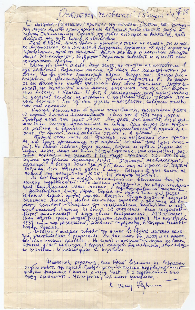 Уважаемая редакция, если будет возможно, не возражаю опубликовать это письмо. Правда документальных подтверждений фактом указанных в письме у меня нет. А с содержанием его прошу ознакомить «Мемориал», быть может пригодиться.