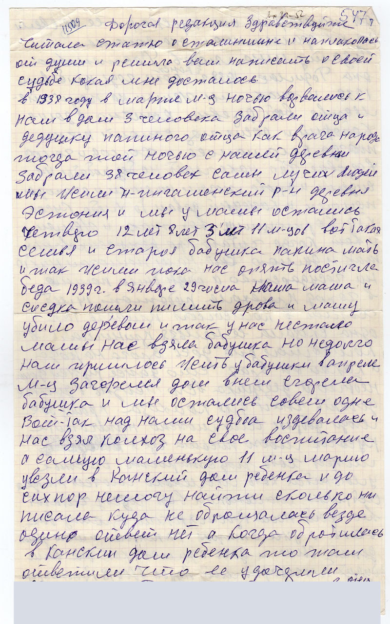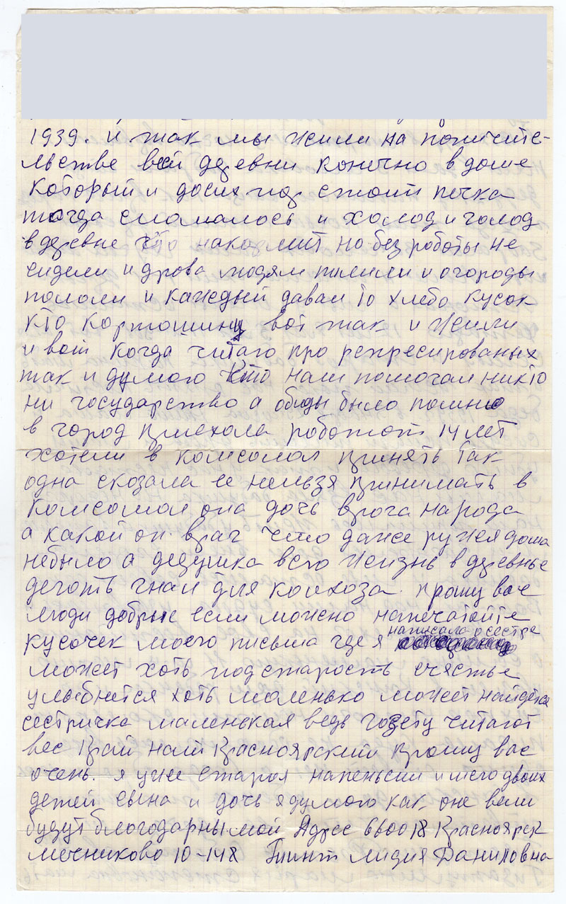 В январе 29 числа наша мама и соседка пошли пилить дрова и маму убило деревом и так у нас нестало мамы нас взяла бабушка но недолго нам пришлось жить у бабушки в апреле м-ц загорелся дом в нем сгорели бабушка и мы остались совсем одне. Вот – так над нами судьба издевалась и нас взял колхоз на свое воспитание а самую маленькую 11 м-ц Марию увезли в Канский дом ребенка и до сих пор немогу найти сколько не писала куда не обращалась везде один ответ нет а когда обратилась в Канскии дом ребенка то там ответили что ее удочерили. <...> и так мы жили на попичительстве всей деревни конечно в доме который и досих пор стоит печка тогда сломалась и холод и голод в деревне кто накормит но без работы не сидели и дрова людям пилили и огороды пололи и каждый давал то хлеба кусок кто кортошину вот так и жили и вот когда читаю про репресированных так и думаю кто нам помогал никто ни государство а обиды было помню в город приехала работать 14 лет хотели в комсомол принять так одна сказала ее нельзя принимать в комсомол она дочь врага народа а какой он враг что даже ружья дома небыло а дедушка всю жизнь в деревне деготь гнал и для колхоза.