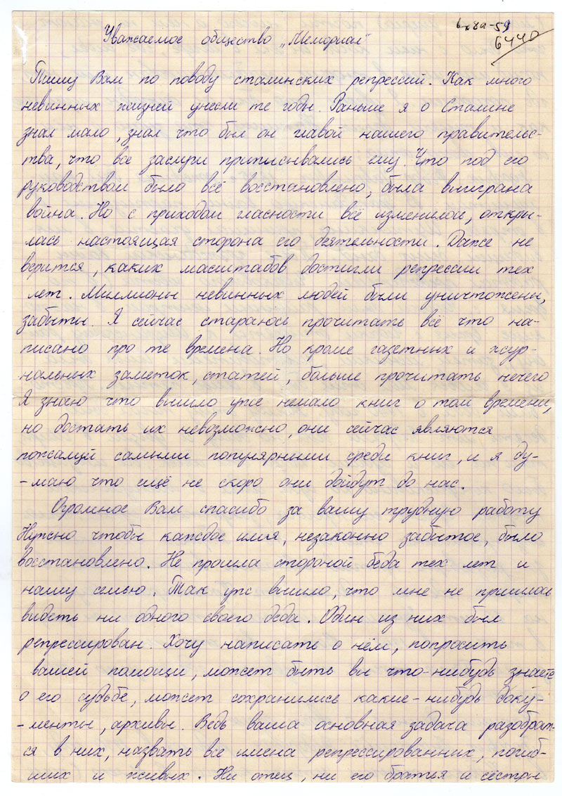 Пишу вам по поводу сталинских репрессий. Как много невинных жизней унесли те годы. Раньше я о Сталине знал мало, знал что был он главой нашего правительства, что все заслуги приписывались ему. Что под его руководством было все восстановлено, была выиграна война. Но с приходом гласности всё изменилось, открылась настоящая сторона его деятельности. Даже не верится, каких масштабов достигли репрессии тех лет. Миллионы невинных людей были уничтожены, забыты. Я сейчас стараюсь причитать всё что написано про те времена. Но кроме газетных и жкрнальных заметок, статьей, больше прочитать нечего. Я знаю что вышло уже немало книг о том времени, но достать их невозможно, они сейчас являются пожалуй самыми популярными среди книг, и я думаю что еще не скоро они дойдут до нас.